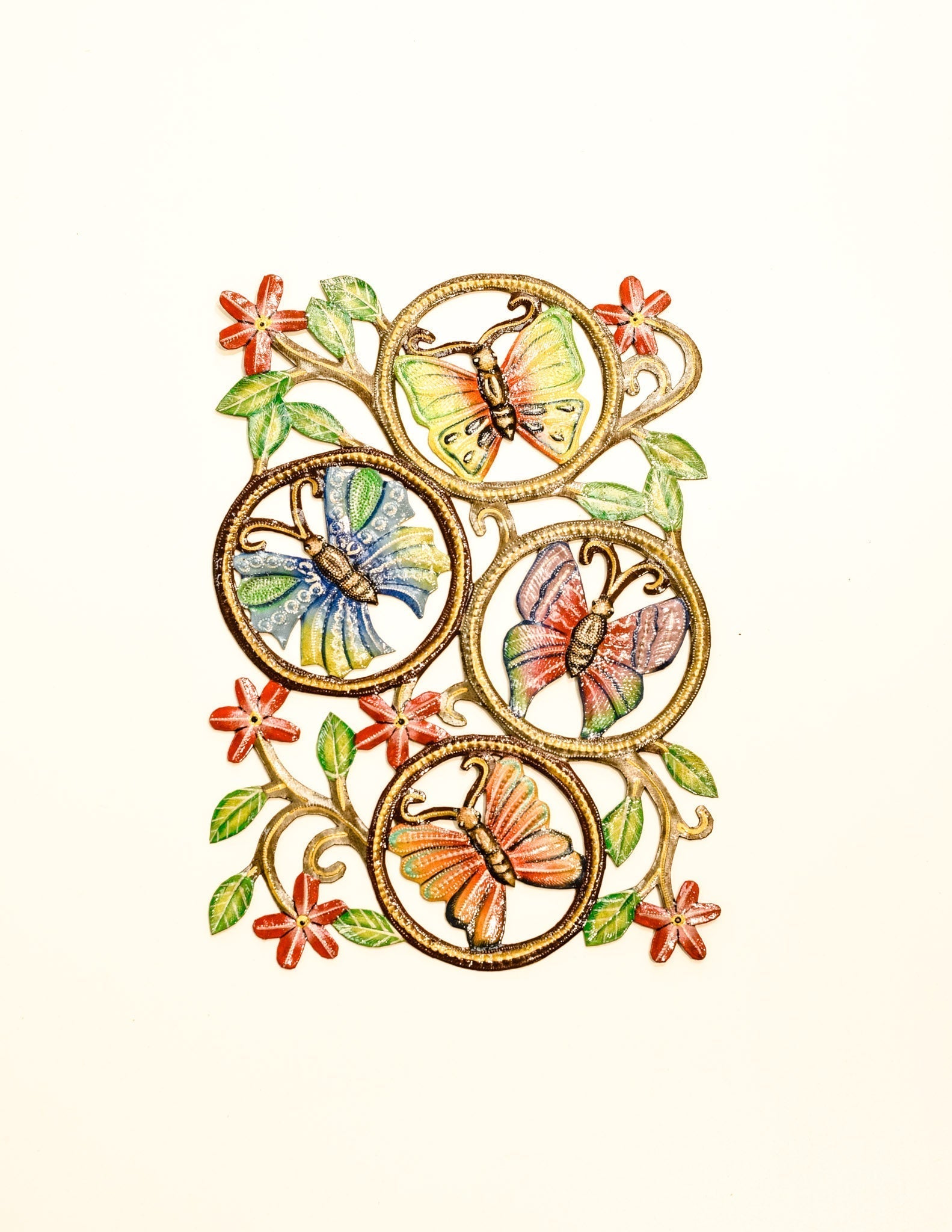 Painted Butterflies on the Wall is a painted‚ panel‚ metal art piece made for both indoor and outdoor decorative use. With unique circular details, colorful butterflies, and vibrantly painted flowers, Painted Butterflies on the Wall will make a visual statement in any home or garden.