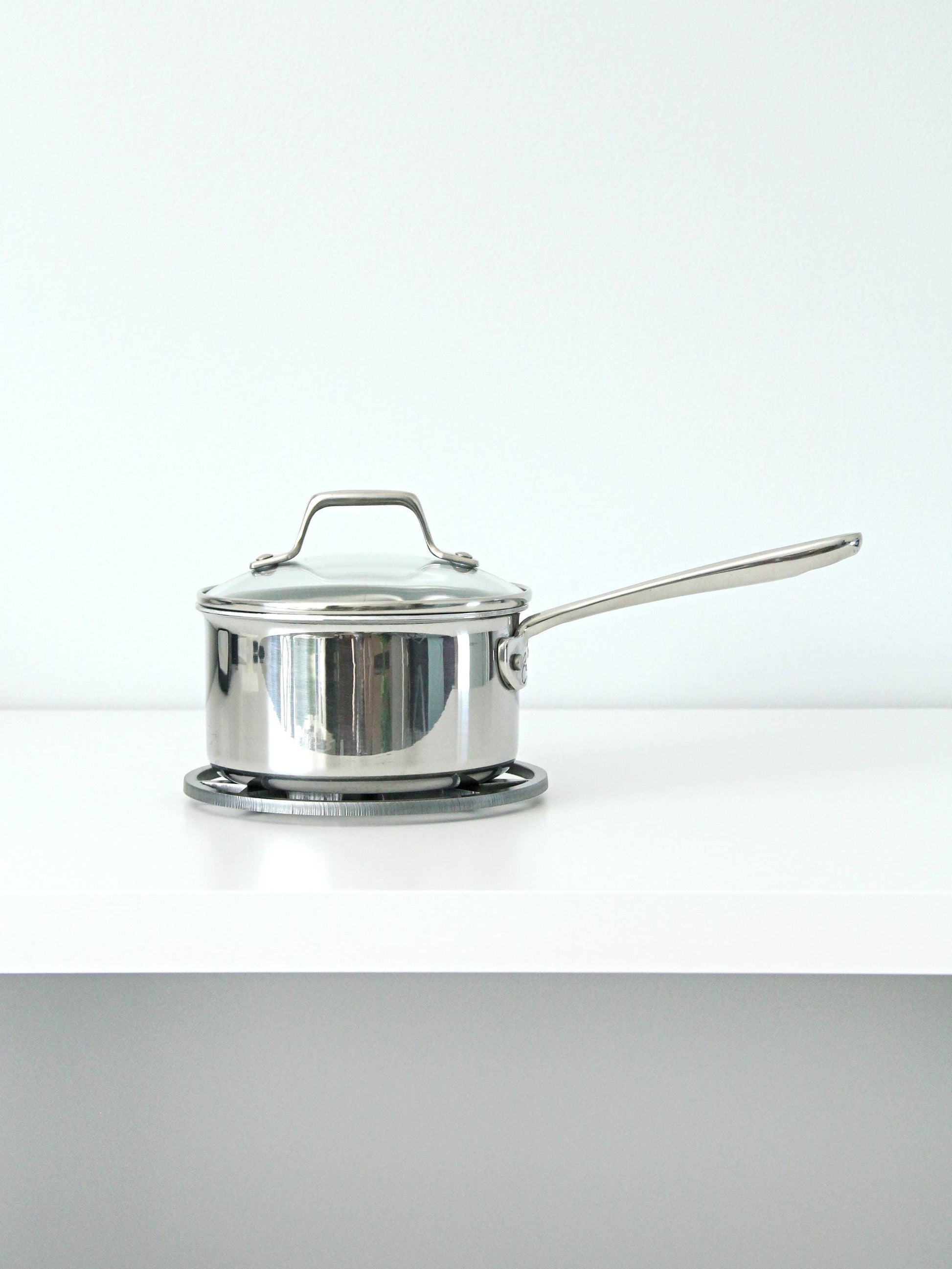 Measures 7" in diameter. Has rubber feet to protect your surface from heat.