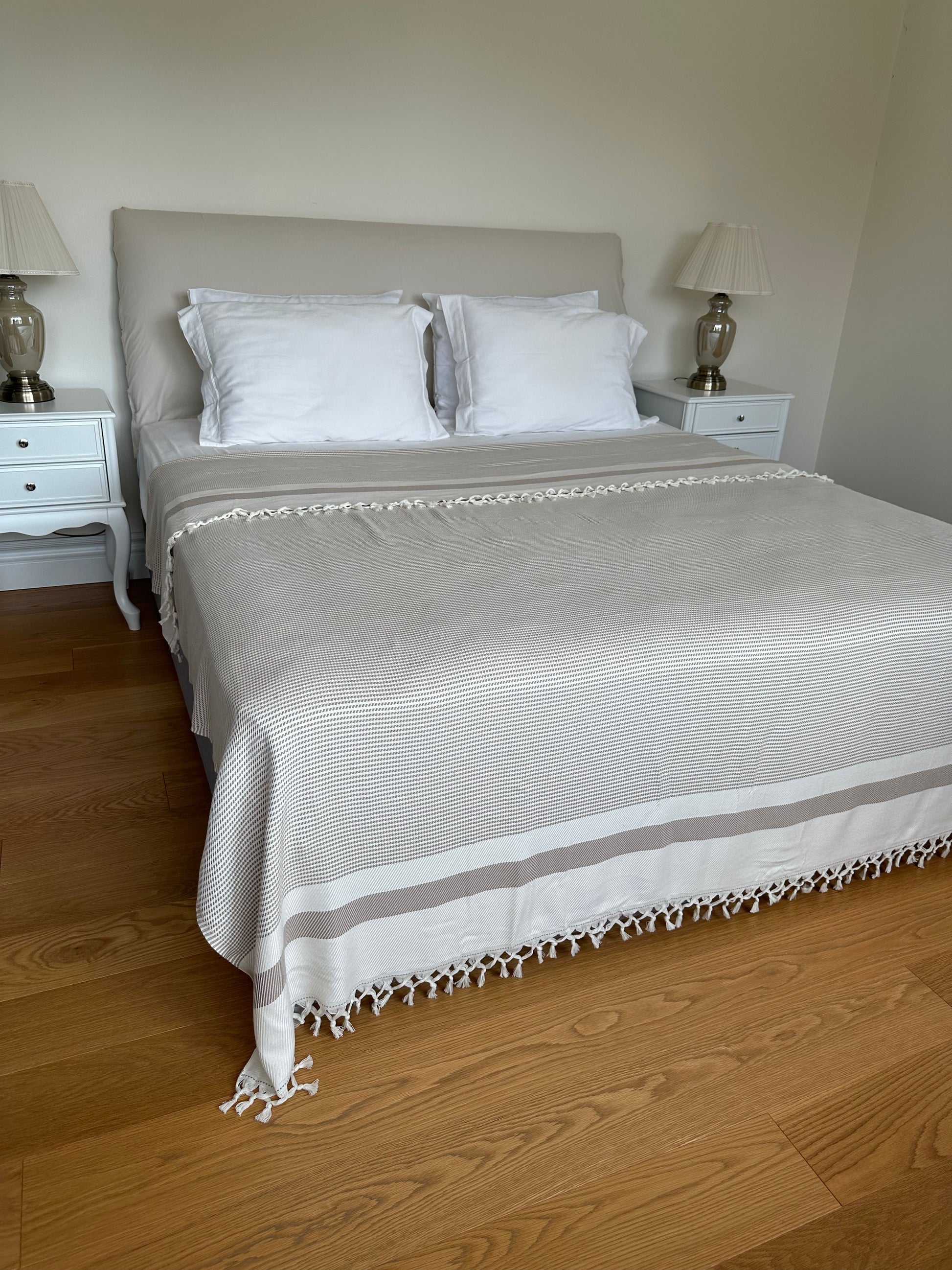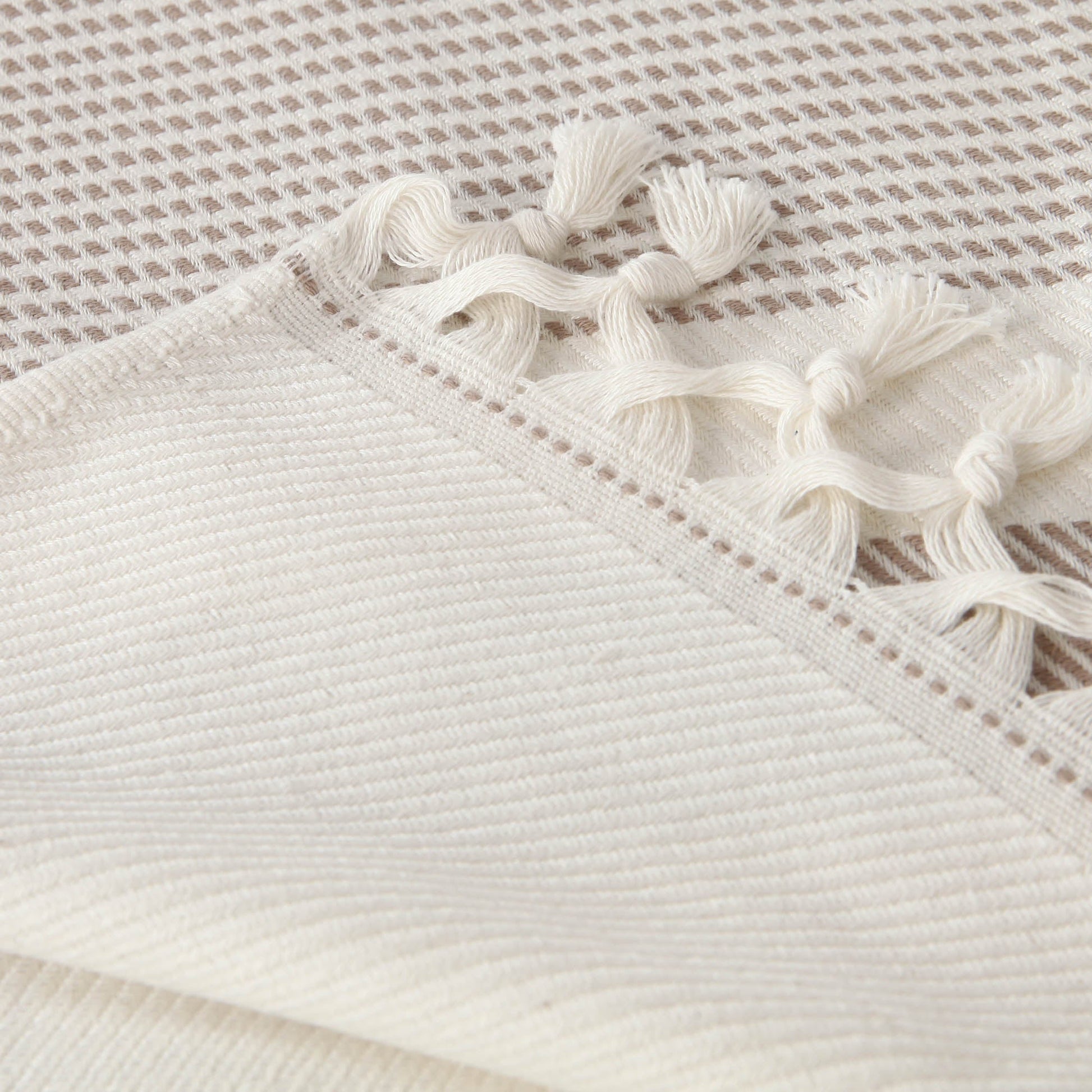The Pixel Turkish Blanket is handwoven from the finest Turkish cotton. It has dots on a cream colored background and hand tied fringes on two sides. The perfect addition to your bed or sofa. Large enough to be used on a queen or king sized bed. Loomed from yarn died, %100 long-staple Premium Turkish Cotton Exceptionally soft and cozy Adds a touch of sophistication and warmth to your space Free of harmful chemicals and dies Suitable for King or Queen size beds Made in Turkey ______________________________________________ Materials: 100% Premium Turkish Cotton Size: 80"x94" Weight: 1300g/46oz Care: Machine wash cold or up to 30℃ in gentle cycle. Avoid fabric softeners, dryer sheets and bleach. Air Dry or Tumble Dry low heat in gentle cycle. We recommend Air Dry as Turkish towels air dry quickly, so you may hang them to dry. Handcrafted by Olive and Linen ______________________________________________