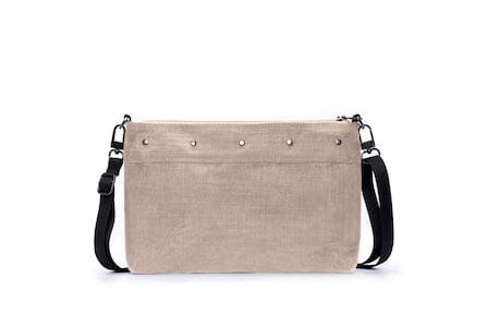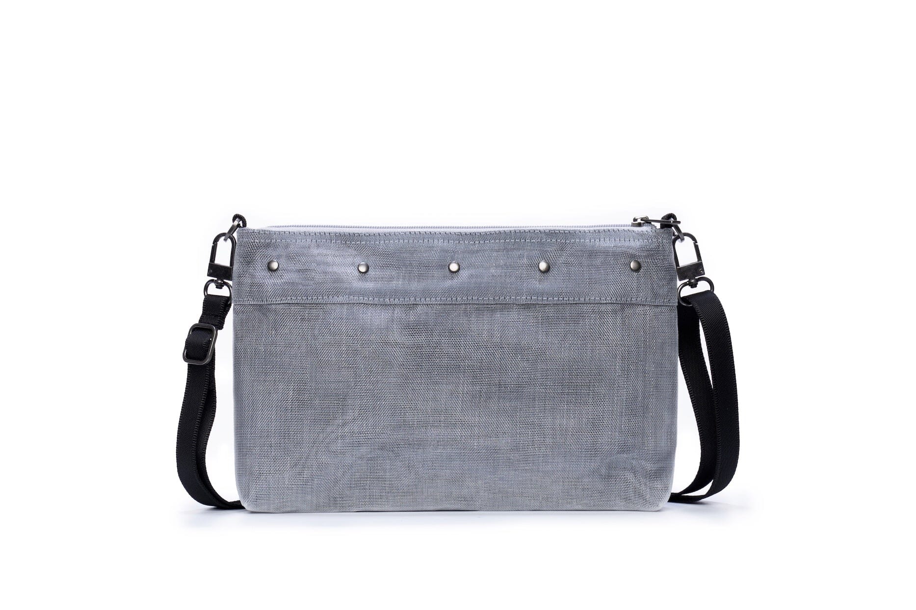 A bold bag that fuses sustainability and style with eyecatching rivet details. Features a a pocket with a zipper and two open pockets (inside), a zipper at the top, and an adjustable and removable shoulder strap. Handmade from repurposed industrial net. Measures 8” H x 12.25” L.