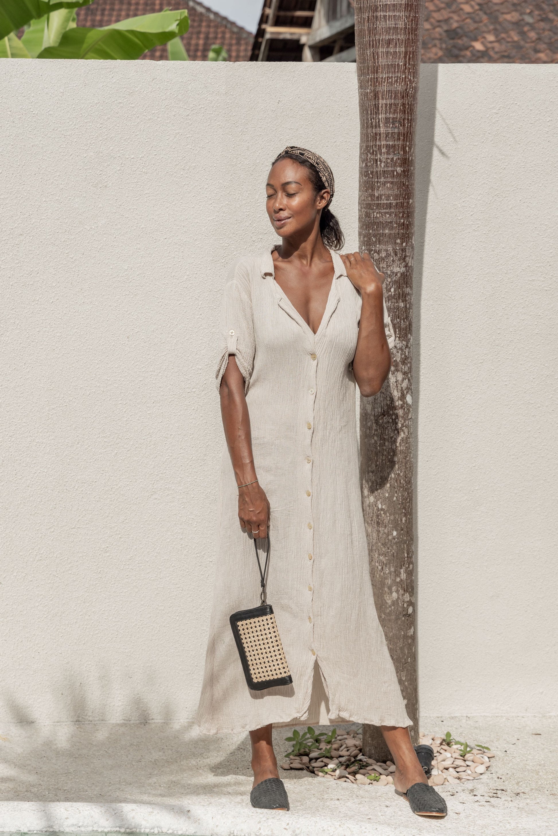 Description This elevated wallet features genuine leather detailing and cane webbing along with ample storage space. The natural elements of this bag combine beautifully to create a modern and bohemian feel. Each bag is handmade by our Balinese Artisan Partners and tells a story of craft, culture and innovation. Available in two colorways - Black and Camel. Size 9"L x 5.5"W Materials Rattan Leather
