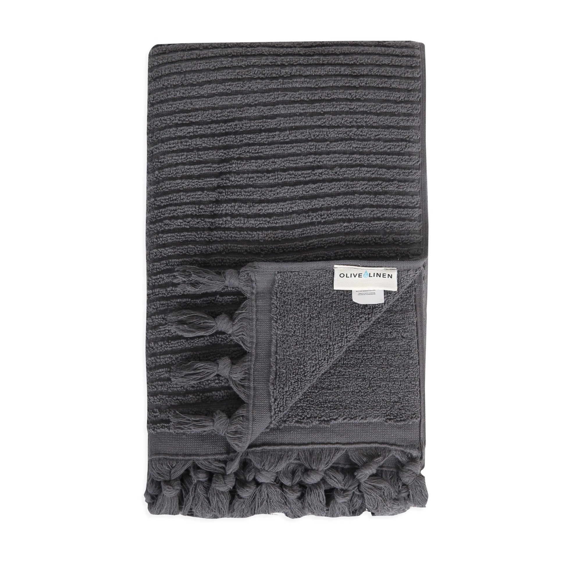 Loomed from yarn died, %100 long-staple Premium Turkish Cotton 600 GSM naturally soft and plush yet feels lightweight, dries fast Features ribbed texture for added drying surface and maximum absorbency Extra-long for added coverage and wraps around comfortably Finished with hand-knotted tassels OEKO-TEX® STANDARD 100 certified, 98.T.1105 HOHENSTEIN HTTI Free of harmful chemicals and dyes – good for you and the environment Pairs perfectly with our Ribbed Loom Turkish Terry Hand Towel Made in Turkey ______________________________________________ Materials: 100% Premium Turkish Cotton Size: 36"x60" Weight: 810g/28.5oz Care: Machine wash cold or up to 30℃ in gentle cycle. Avoid fabric softeners, dryer sheets , bleach and oxygen based bleach. Do not leave wet in the washing machine. Lay flat to dry or move to the drier as soon as wash cycle is finished. Air Dry or Tumble Dry low heat in gentle cycle. We recommend Air Dry as Turkish towels air dry quickly, so you may hang them to dry. Avoid contact with household cleaners, whitening toothpastes and skin care products containing benzoyl peroxide. Handcrafted by Olive and Linen ______________________________________________