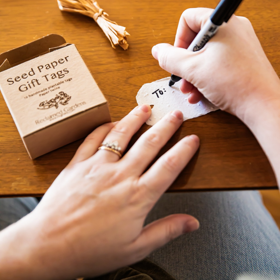 What better use for junk mail, bills, and receipts is there than to upcycle it into practical gift tags! These are individually made gift tags with wildflower seeds. Each one can be saved and planted in the spring - the gift that keeps on giving.
