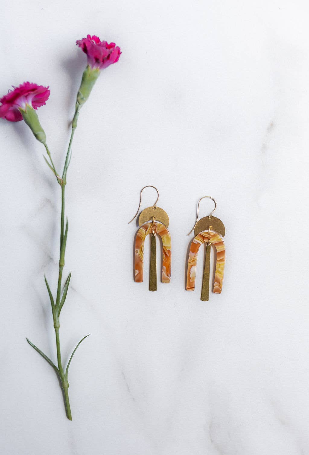These statement earrings will be your new bestseller. Regardless of what is paired them with, these beauties will turn heads. These have become our most sought after design and they certainly don't disappoint! This pair features orange, cream, and light yellow sorbet acrylic U shape paired with a brass moon and center finding. These earrings are 3" long. These earrings are nickel-free and hypoallergenic. We partner with Agape International to aid in the fight against human trafficking.