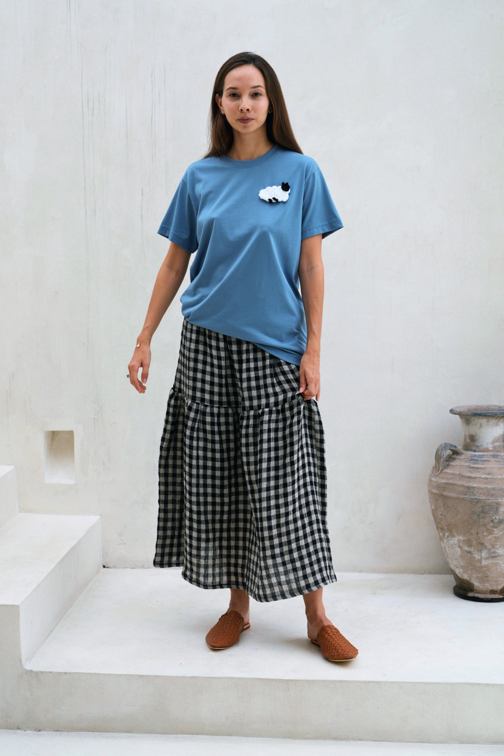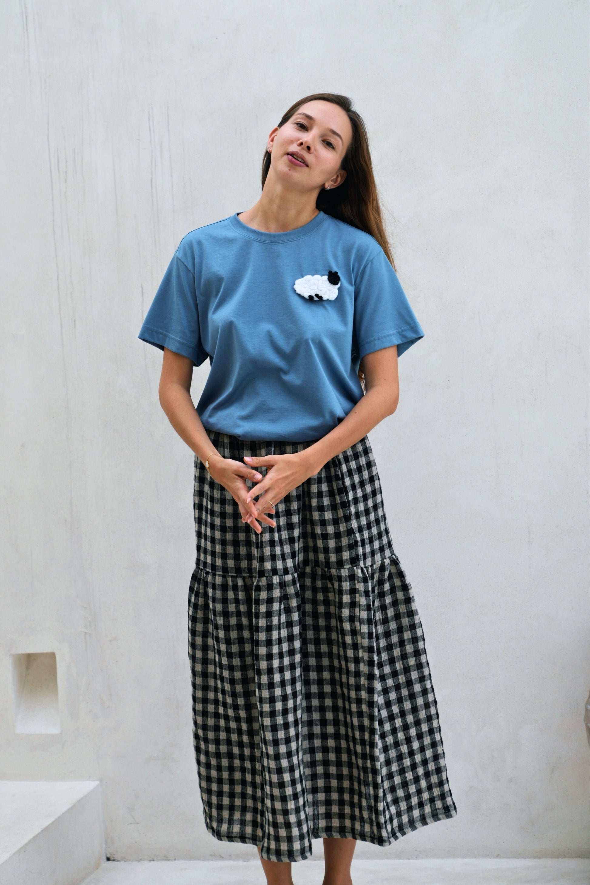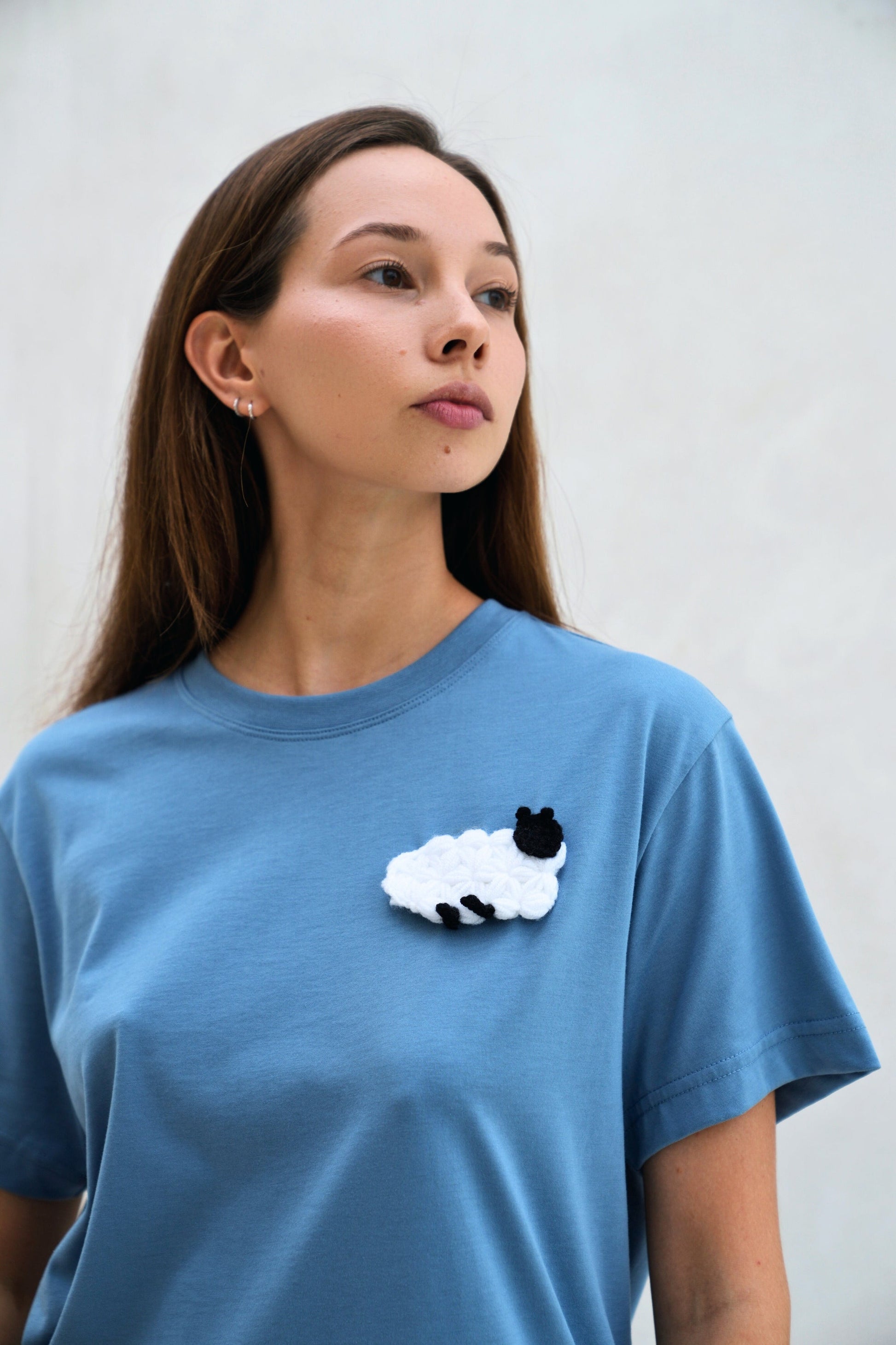Show off your lively, outspoken side in this lovely soft SUPIMA cotton and boldly hand embellished sheep crochet fabrication for an added special touch on a crewneck T-shirt.