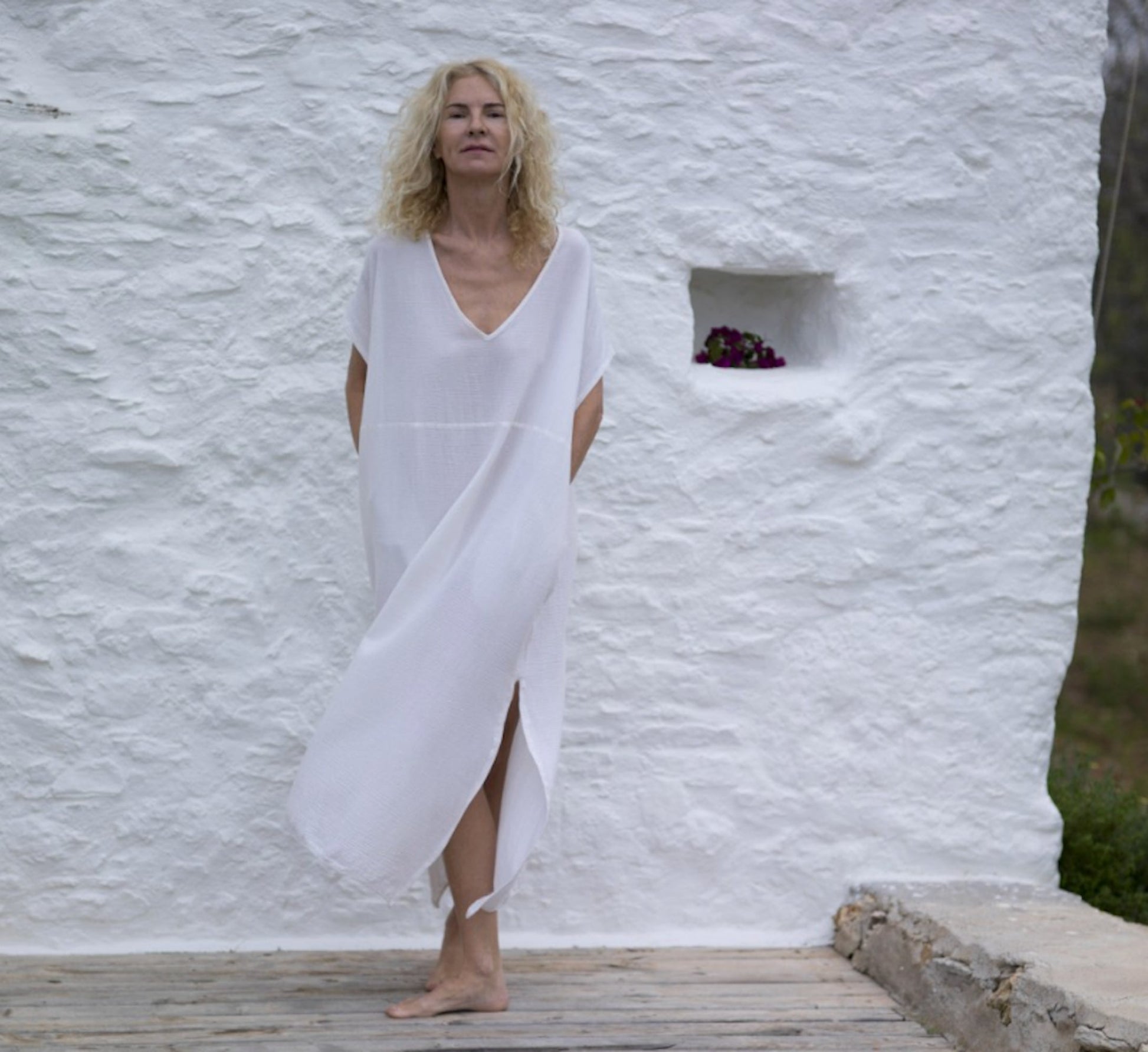 The V-neck classic caftan is perfect as an easy elegant beach cover-up or as a dress for a warm day! With its relaxed form, it's flowy, organic, and simply chic. Its short sleeves complete the two slits on its skirt, creating a flattering look for all! Ethically produced, made for your comfort and style. Dress it however you see it fits you! Hand-loomed from organic cotton washed in the sea and dried on the sand, the fabric of the dress has durability and a uniquely soft texture, letting the gauzy Sile fabric breathe and touch the skin lightly. One size fits all