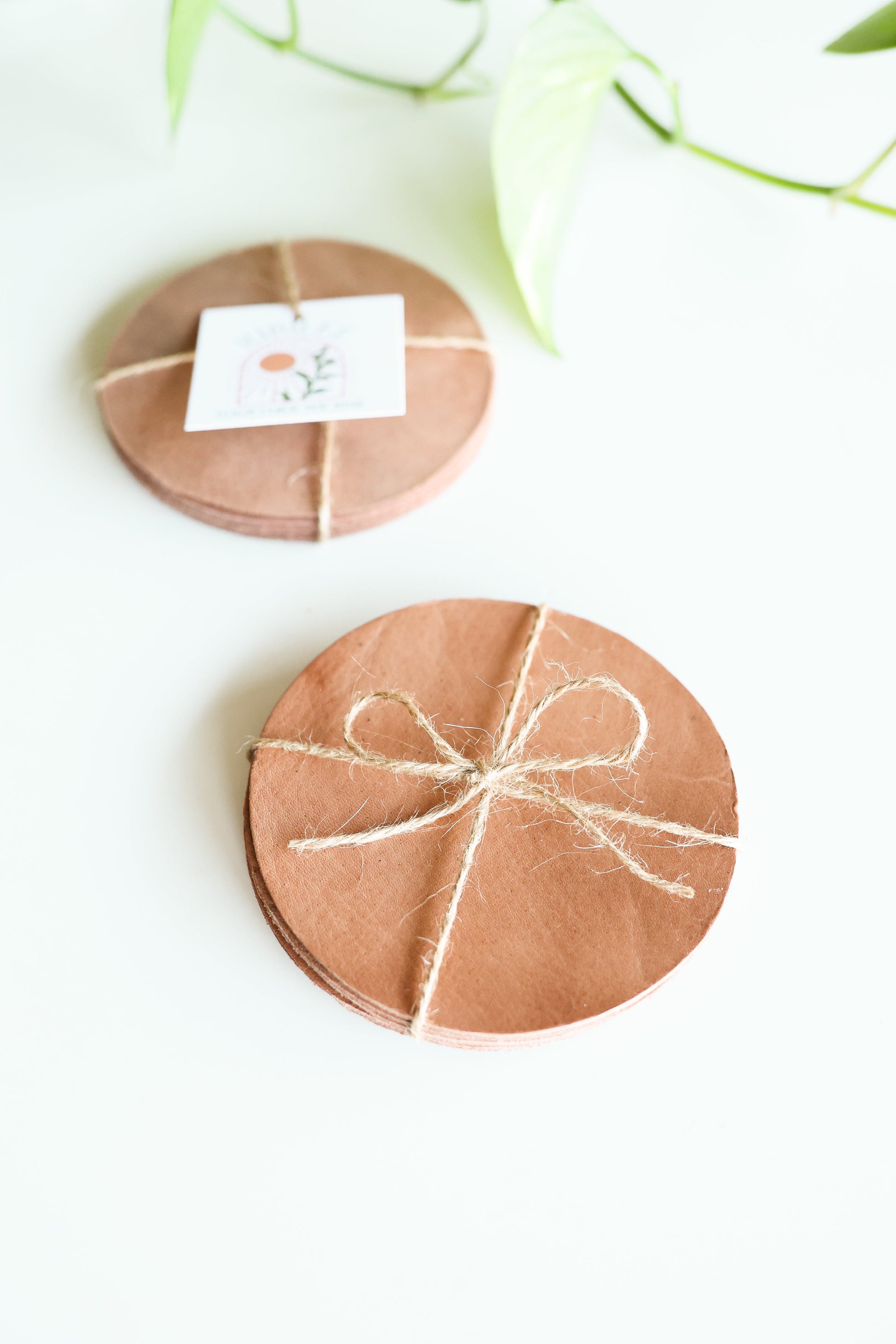 This simple coaster set brings natural beauty and texture to every room of the house. Crafted of leather, they're expertly cut by hand. The coasters feature a neutral hue that works well with a range of interior design styles.