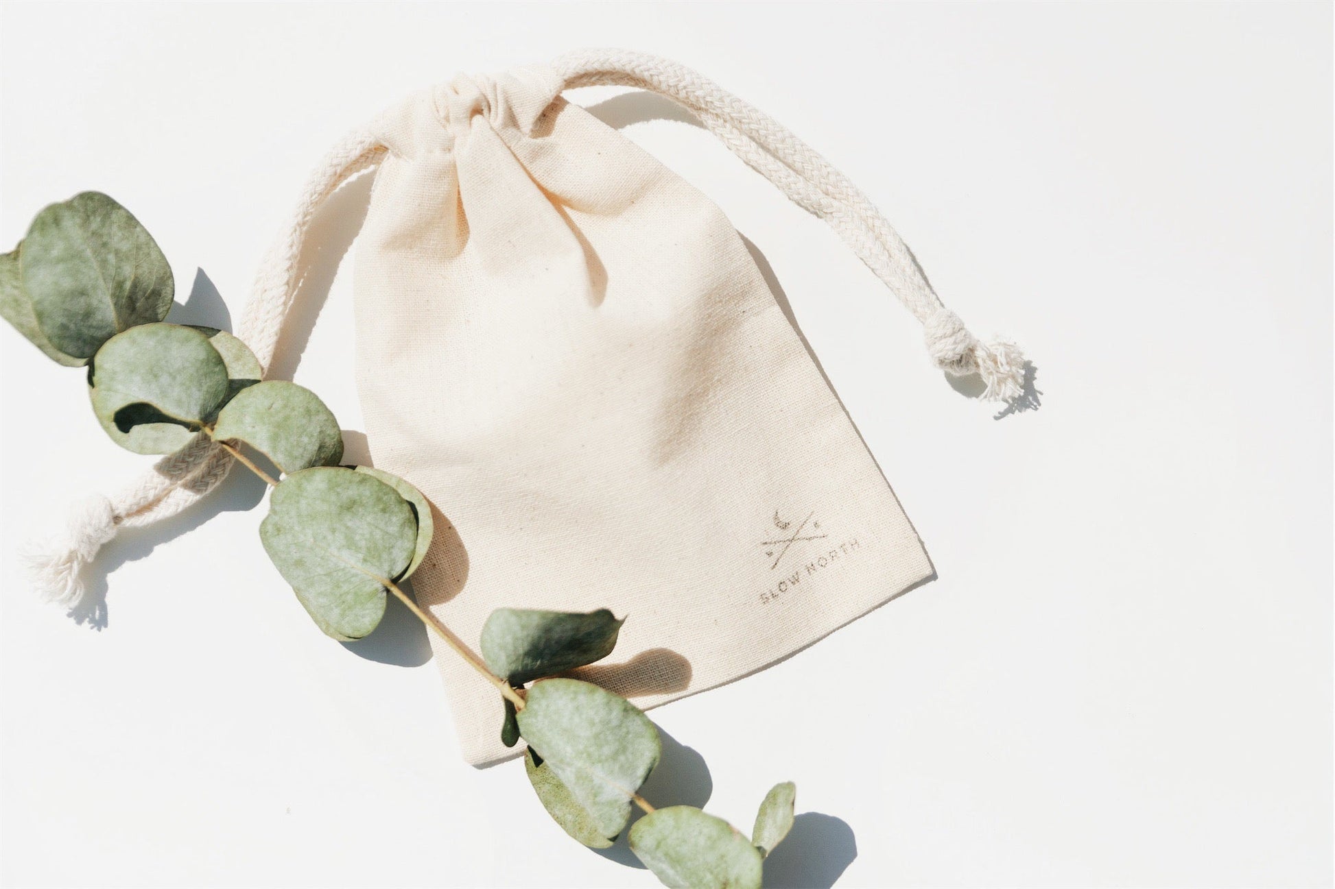This small cotton gift bag features a tie string for secure closing and is perfect for small gift items such as crystals, jewelry, and small ceramics. This unbleached muslin cottonåÊbag features a small Slow North logo stamped in black ink and measures approximately 4" x 6".