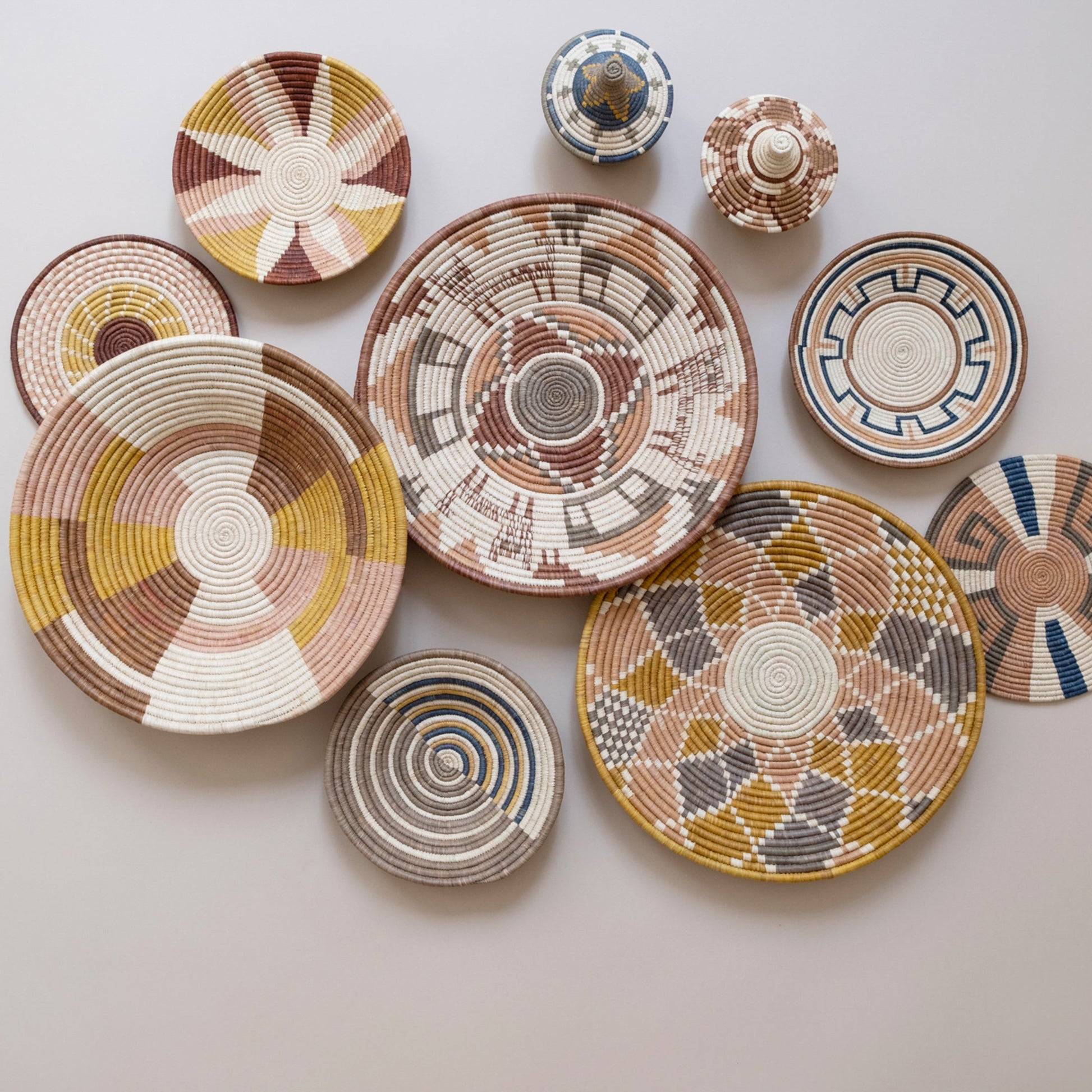 The hand-dyed raffia is twisted and wrapped around coils of banana fibers, creating structure and intricate designs.