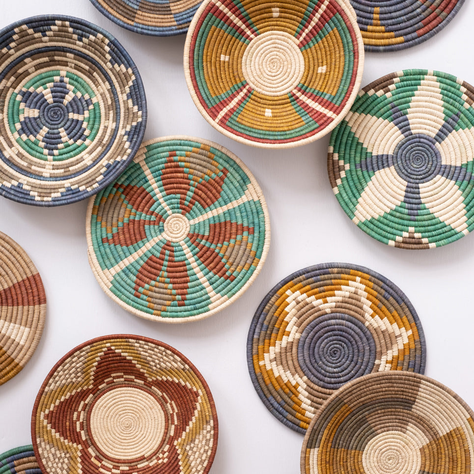 - The hand-dyed raffia is twisted and wrapped around coils of banana fibers, creating structure and intricate designs.