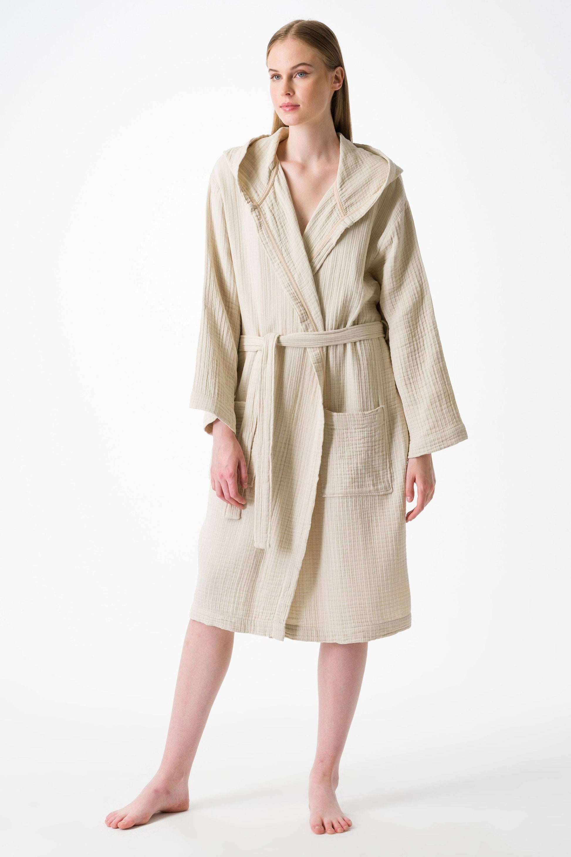 Our Soho Supersoft Robes are expertly hand crafted from 4 ply muslin cloth made from premium long-staple Turkish cotton. Luxurious texture in a lightweight and absorbent Robe. 4 layer muslin construction from 100% long-staple Turkish cotton Yarn died and garment washed for added softness Naturally crinkled texture and frayed edges add a relaxed appeal Super soft, breathable and luxurious Feels fresh and cool for summer yet substantial enough for winter Free of harmful chemicals and dies Made in Turkey ______________________________________________ Materials: 100% Premium Turkish Cotton Size: 1-Small/Medium and 2-Large/XL Weight: 572g / 20oz Care: Wash in cold water, tumble dry low or hang to dry Handcrafted by Olive and Linen ______________________________________________