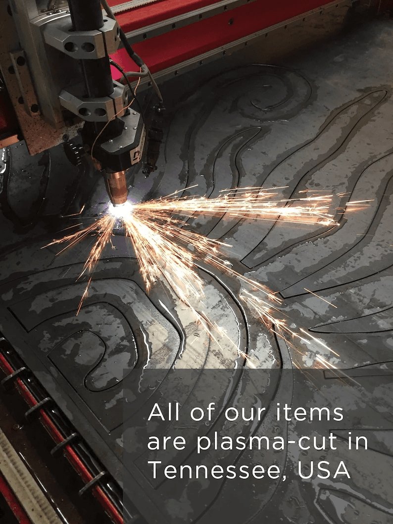 For each piece, designer and shop-owner Stephanie creates a unique design that will only be found in this shop. She sends that art over to her dad, Steve, who operates their CNC (Computer Numeric Control) Plasma Cutter. This machine is driven by Stephanie's design to create her art with precision using a plasma (think liquid fire) torch. Steve then buffs off any rough edges giving you a smooth finish. Stephanie and her assistant then inspect each piece, give it a good cleaning, and pack it up for you to enjoy!