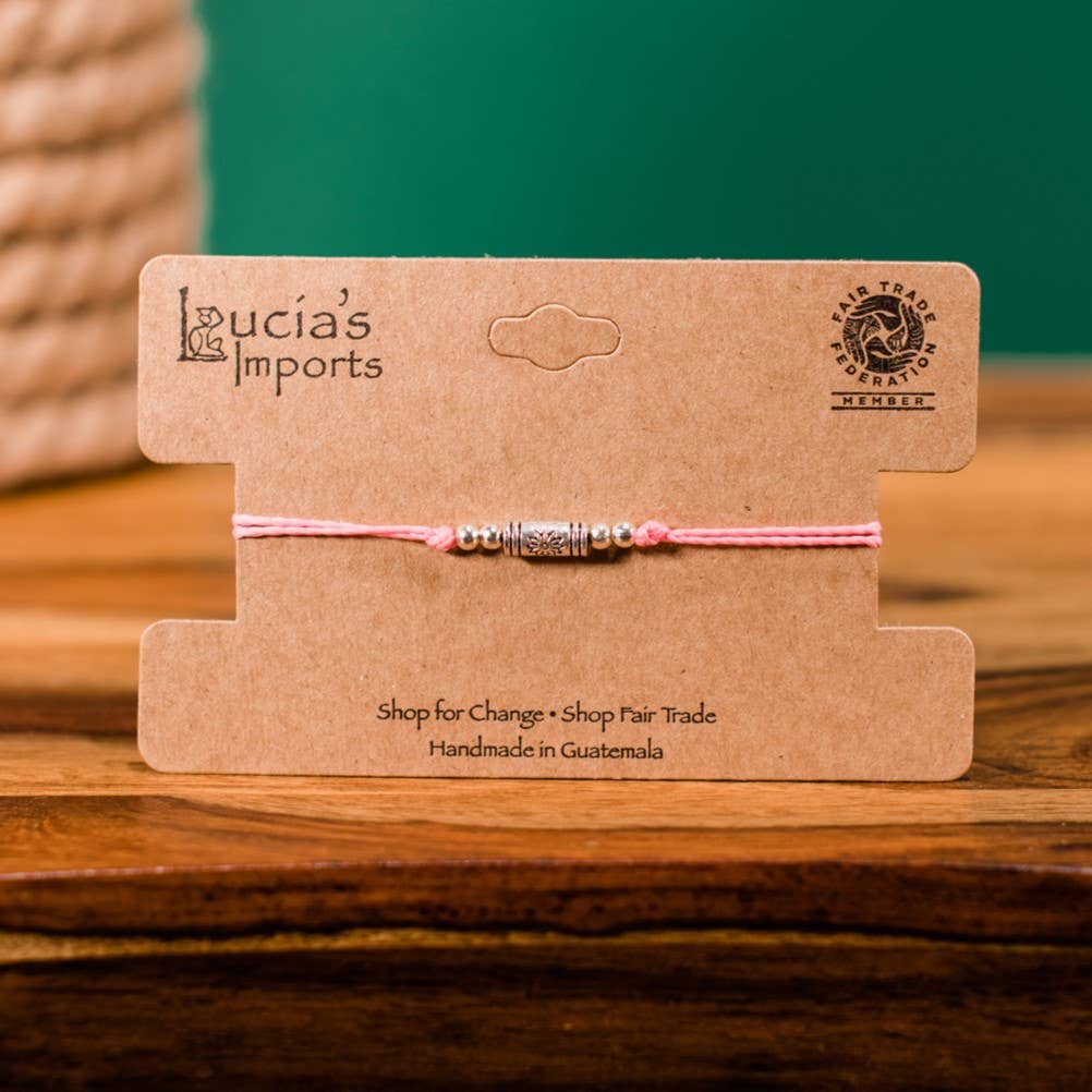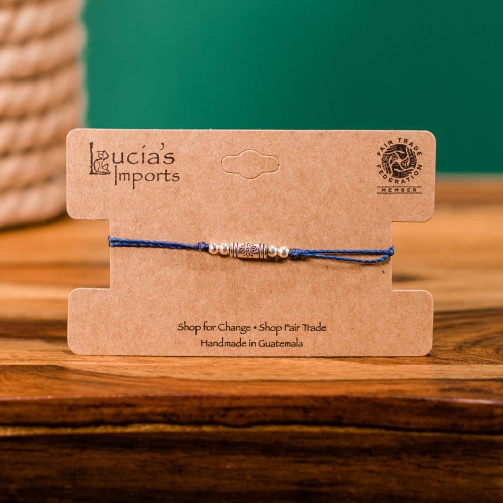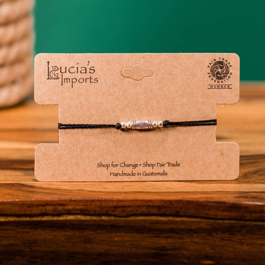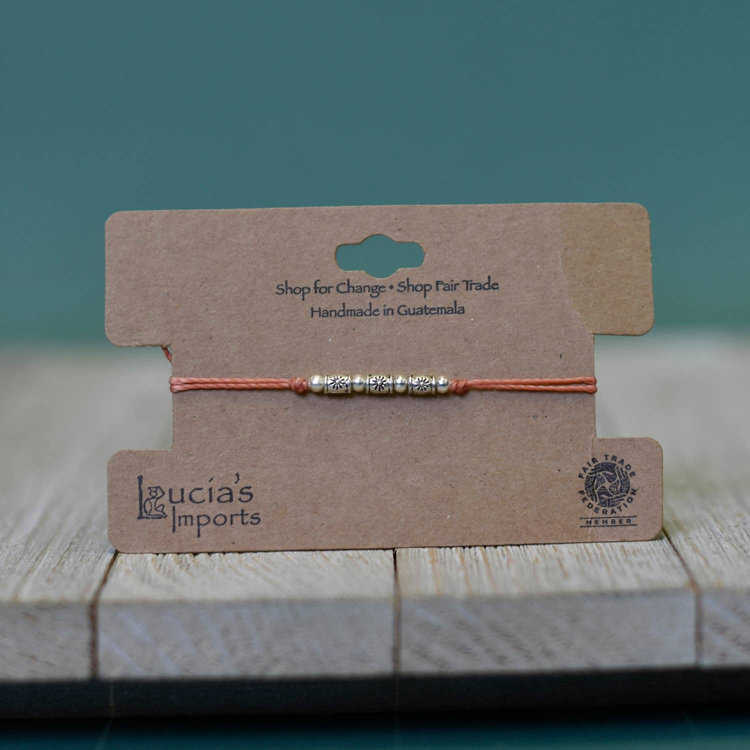 This fair trade String Bracelet is made from colorful string with a silver metallic row of sun beads at the center. Each bracelet features a pull string slip knot closure to make them easy to wear. Stack them or wear it separately. Comes in assorted colors. Charm may vary. Each purchase empowers Guatemalan artisans.