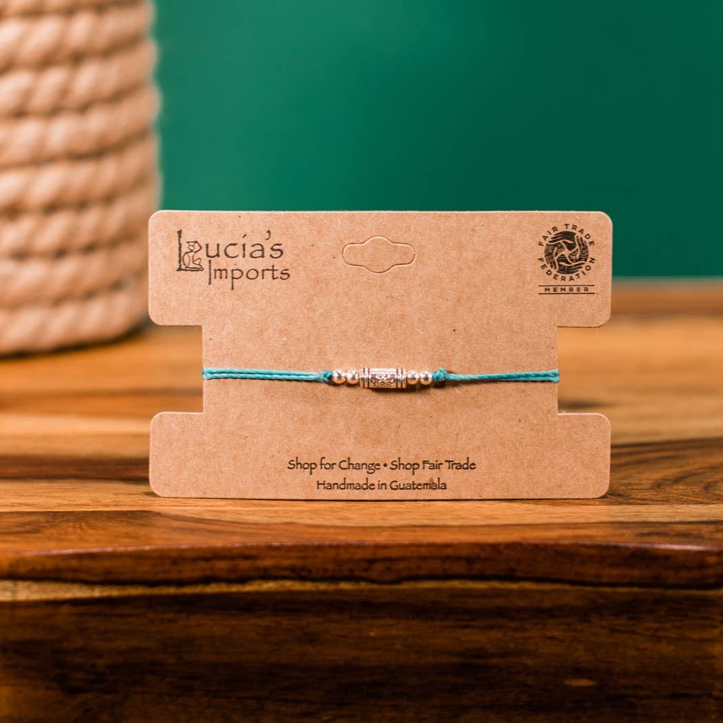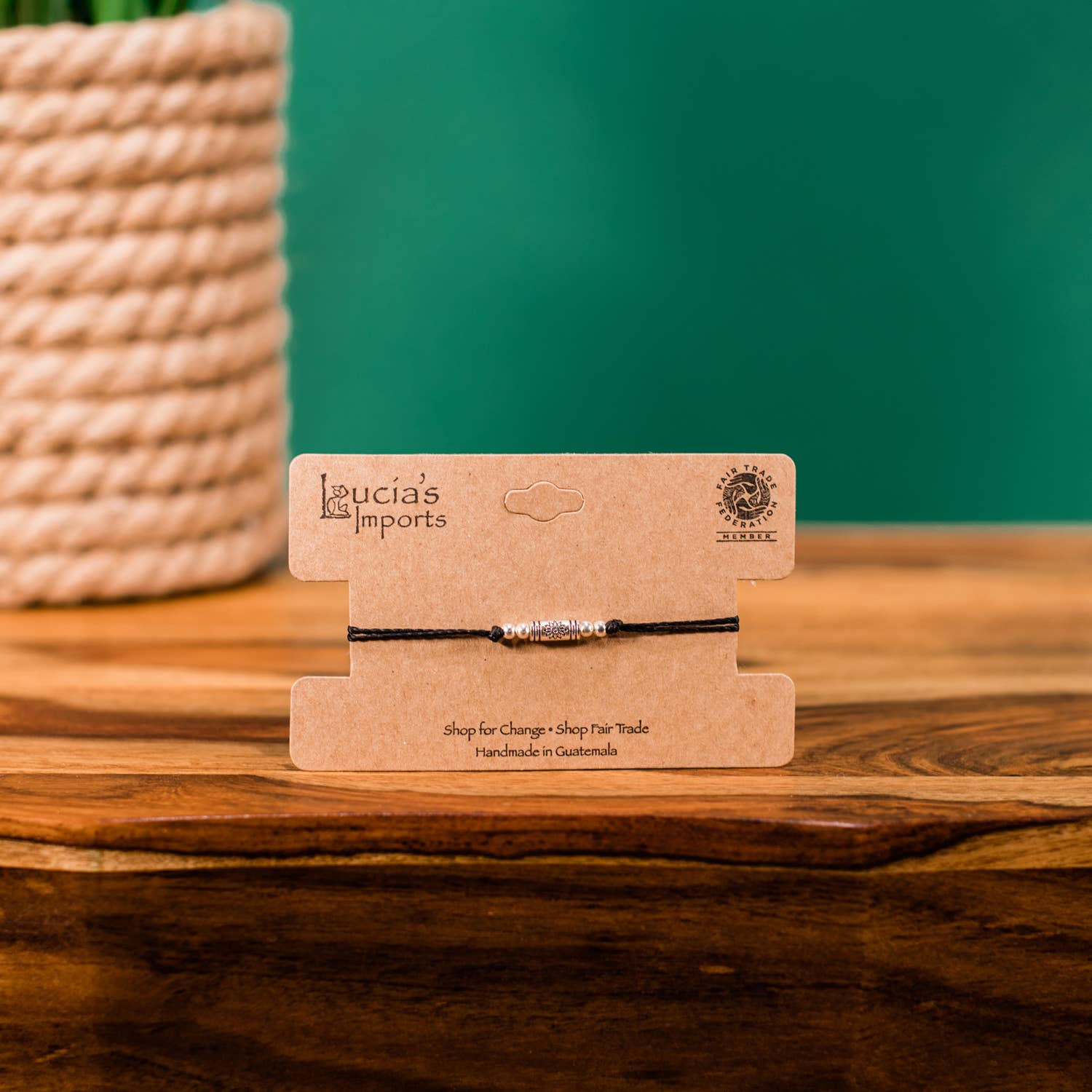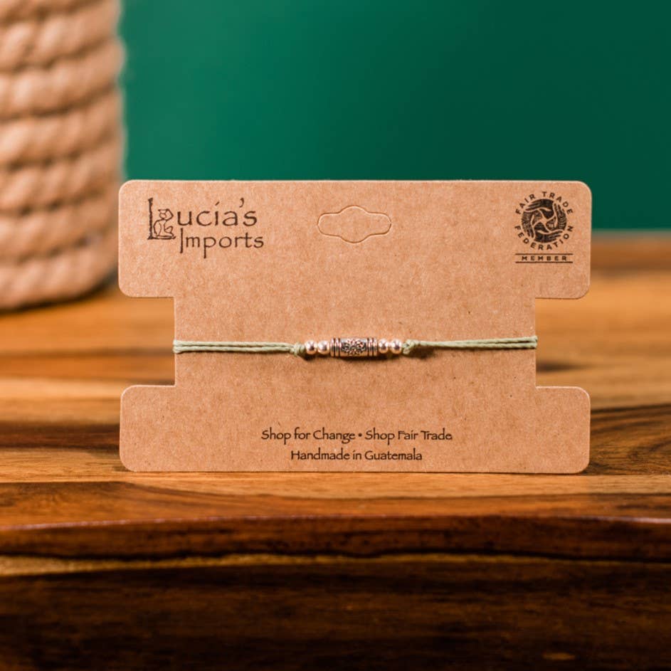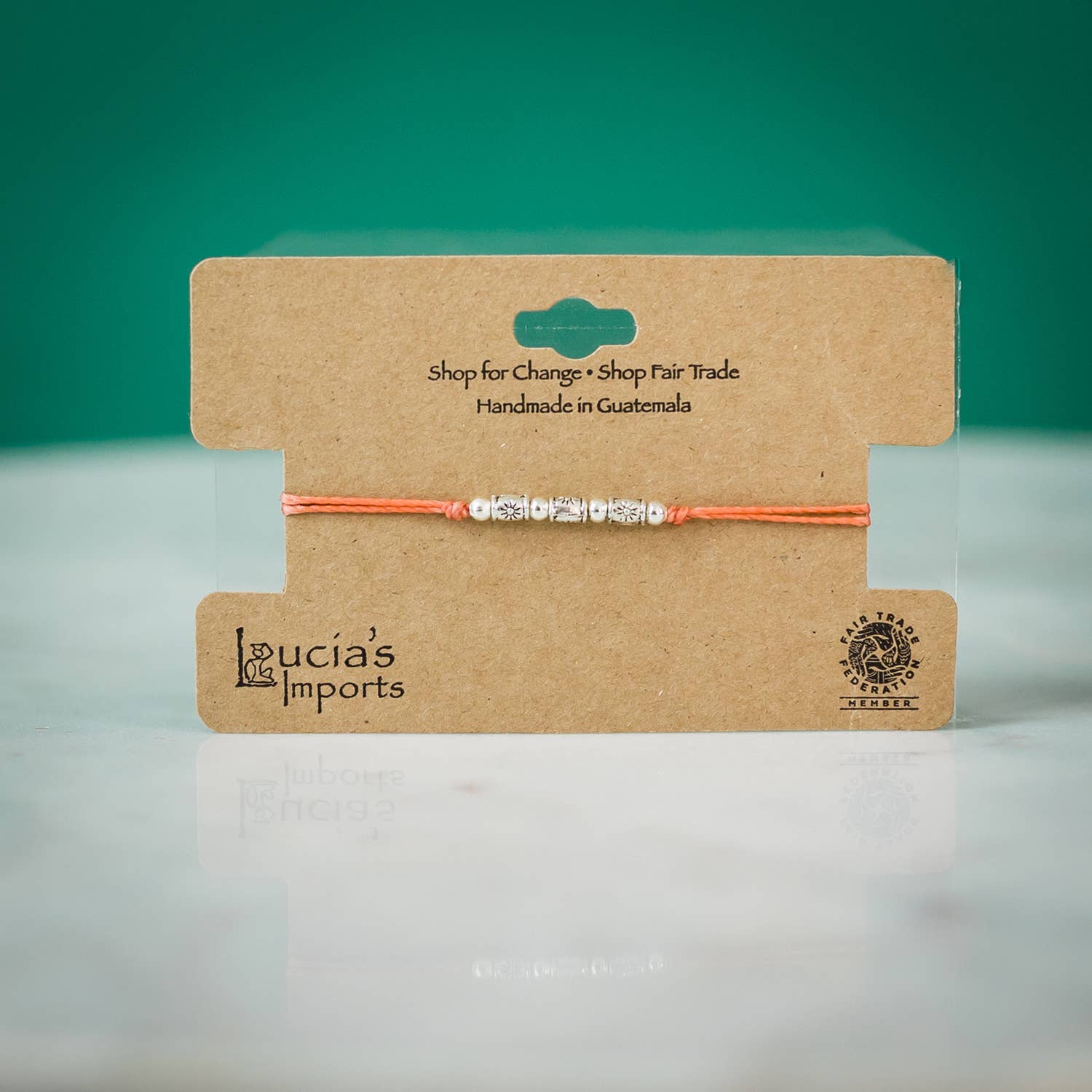 This fair trade String Bracelet is made from colorful string with a silver metallic row of sun beads at the center. Each bracelet features a pull string slip knot closure to make them easy to wear. Stack them or wear it separately. Comes in assorted colors. Charm may vary. Each purchase empowers Guatemalan artisans.