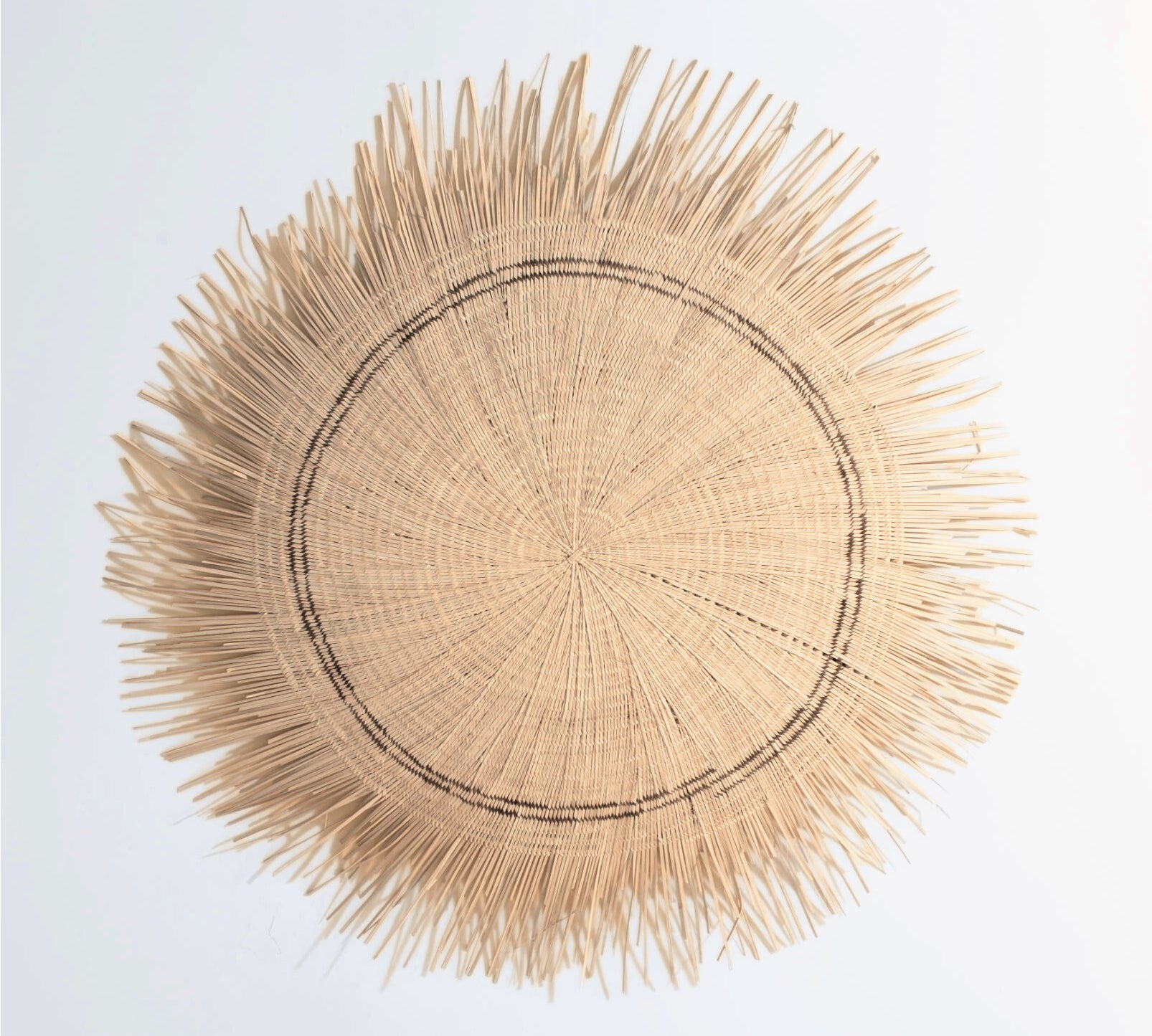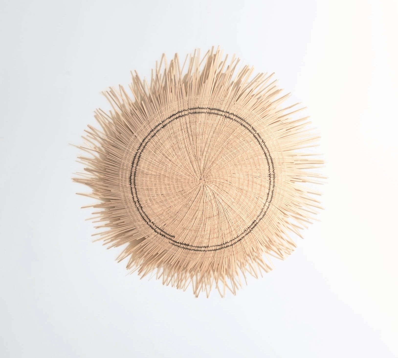 Iconic woven walldecor, inspired by the Sun. Bold and intricately woven to brighten your space every day. Natural with a brown stripe. Made in Malawi.
