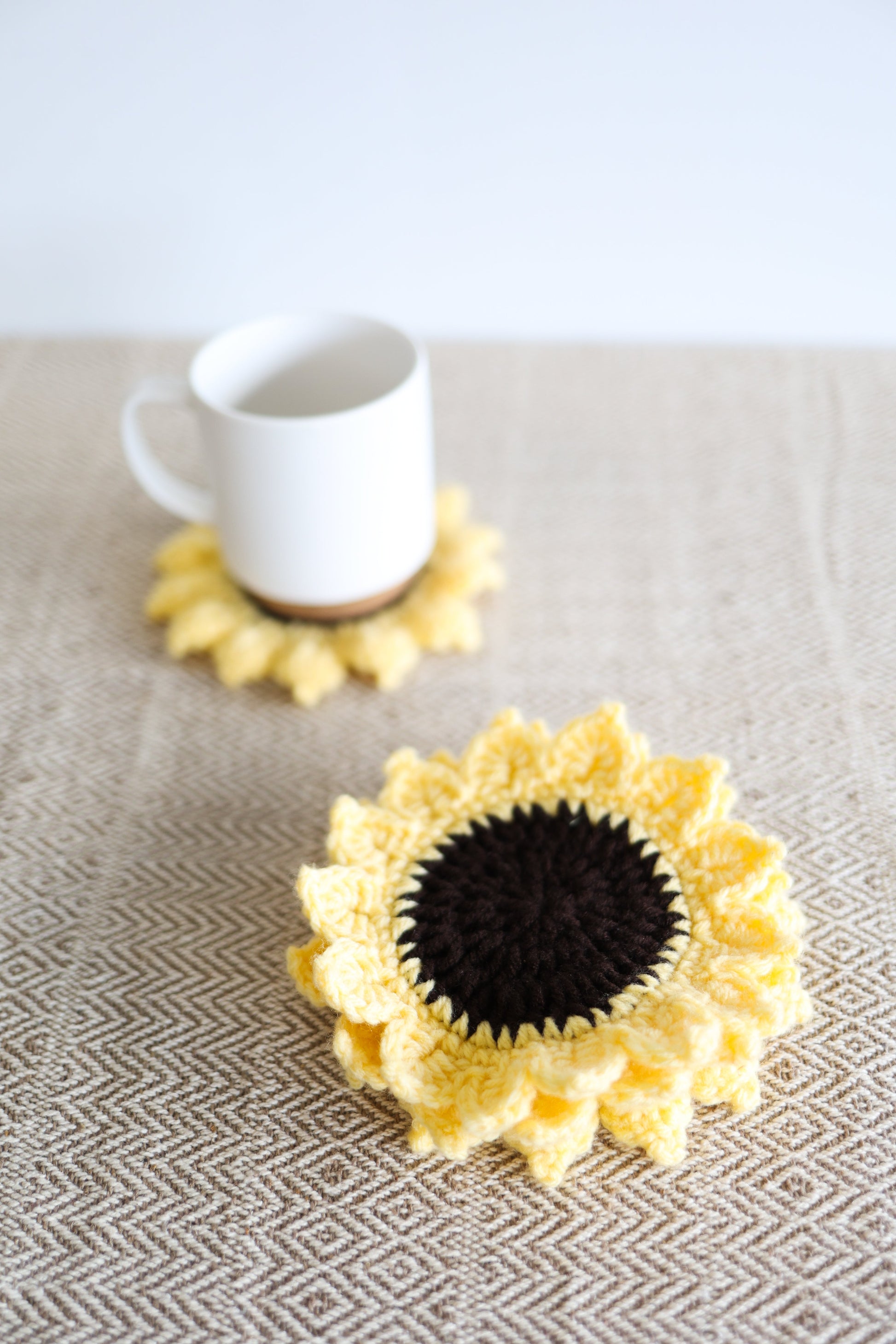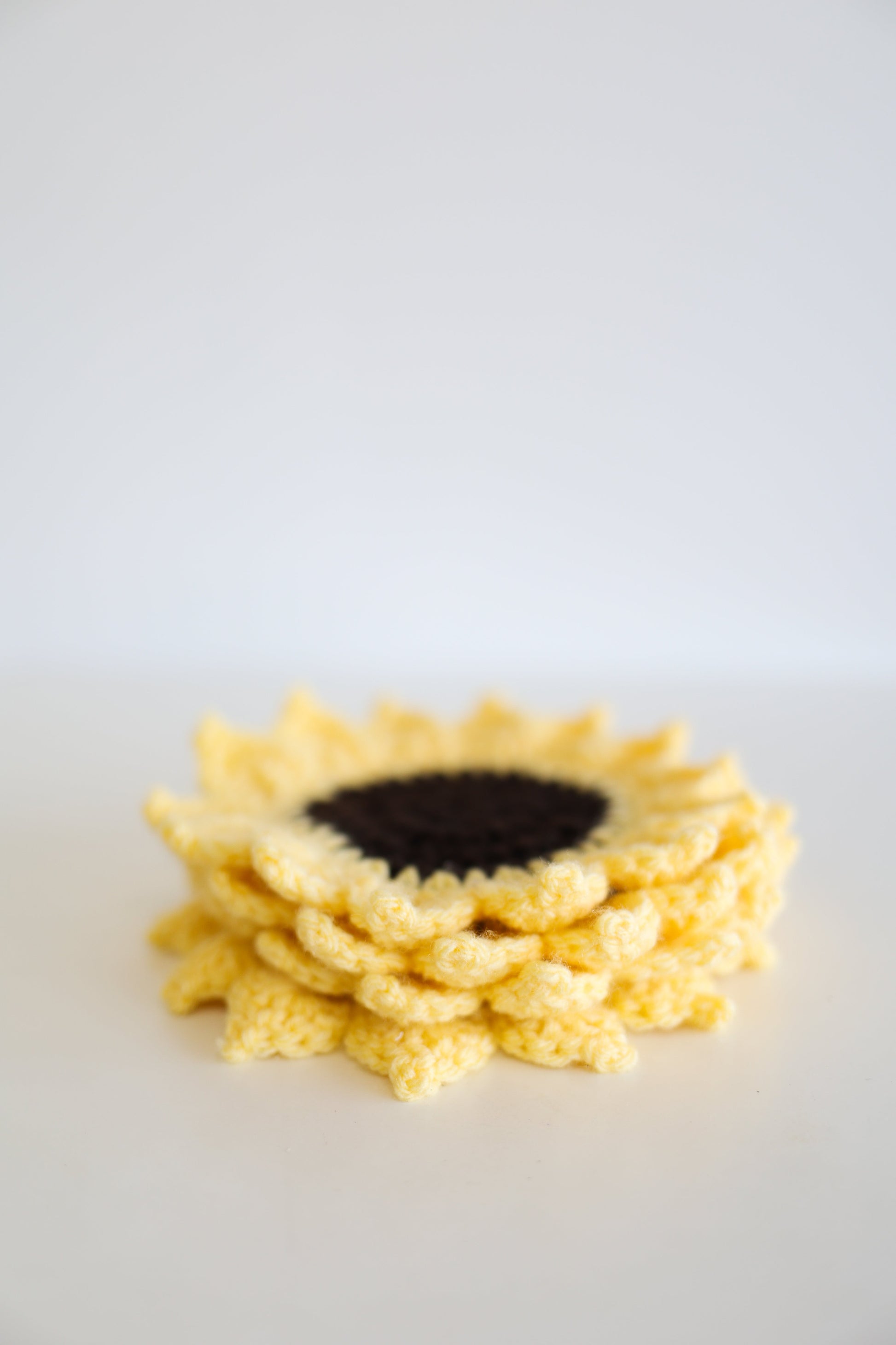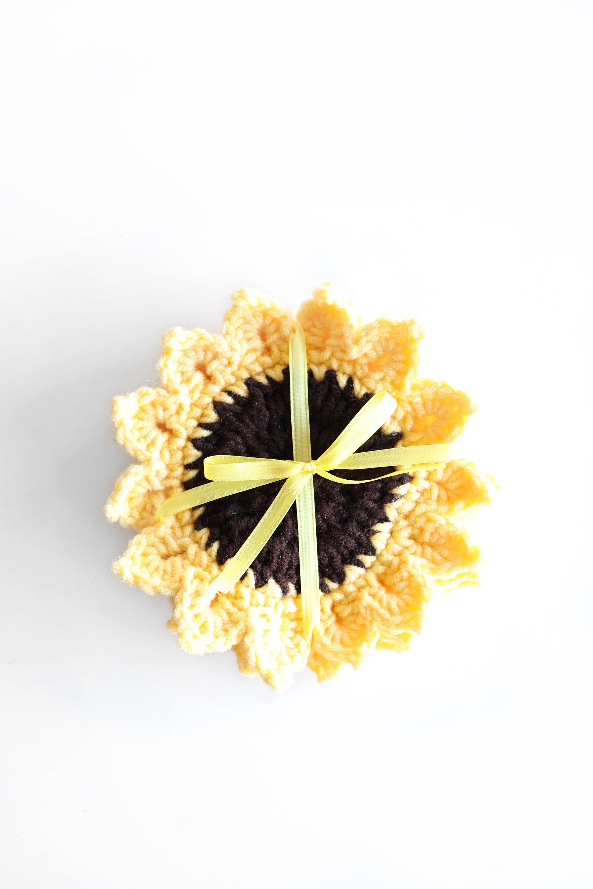 This cute set of four sunflower coasters is sure to brighten up any space in your home! These are a soft yellow acrylic yarn with brown center, tied together with a ribbon. Handmade in the Dominican Republic, employing a girl aging out of a children's home.