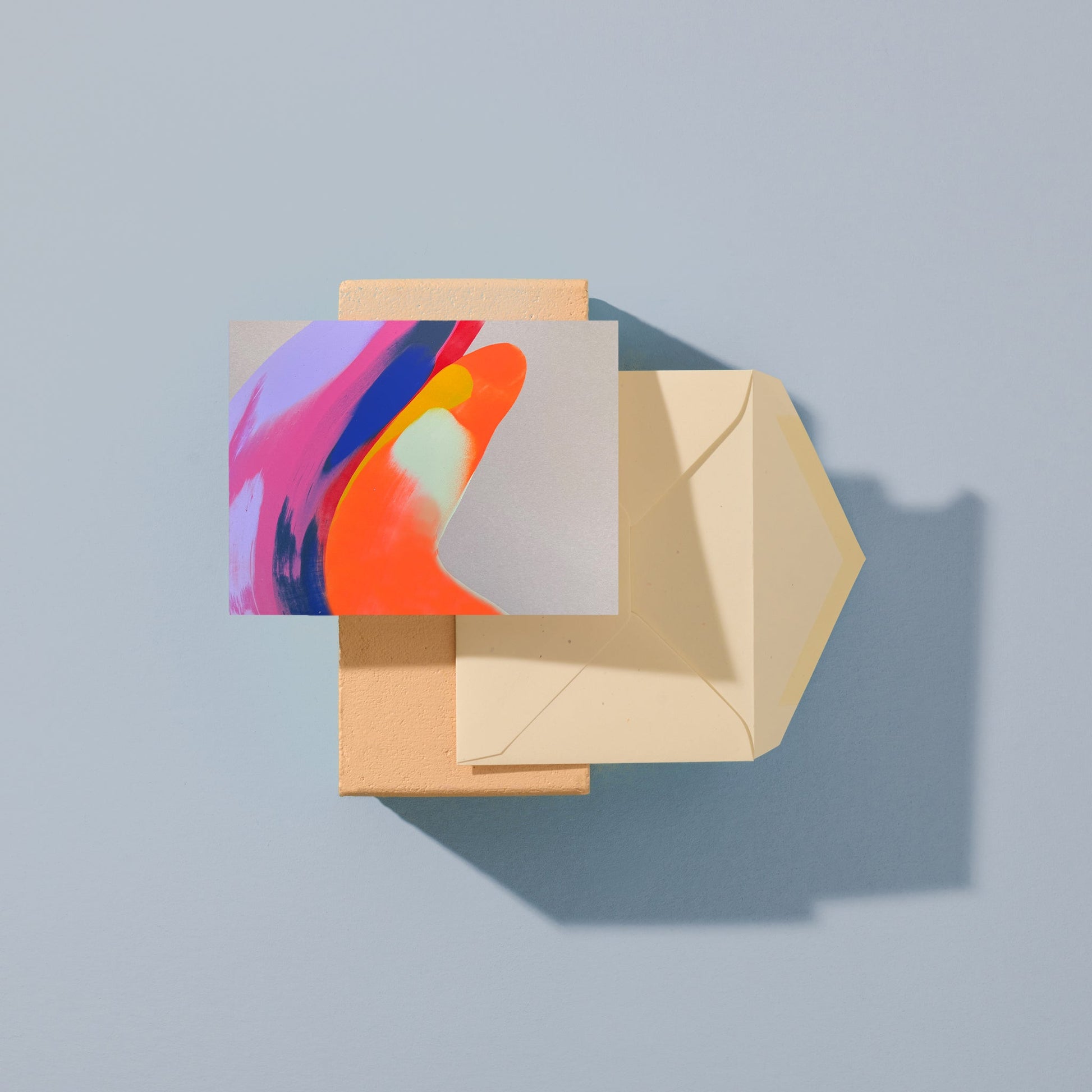 Hand painted card set. This set contains 6 unique cards with matching envelopes. Cards are blank inside. Each card is hand painted on large pieces of card stock before foil stamping on one of our antique foil presses. The result is an entirely one-of-a-kind card. This card uses our swirl painting process. Card size: 5.5 x 4.25" folded card Made in the USA in Des Moines, Iowa. Packaged in our signature die-cut box perfect for gifting.