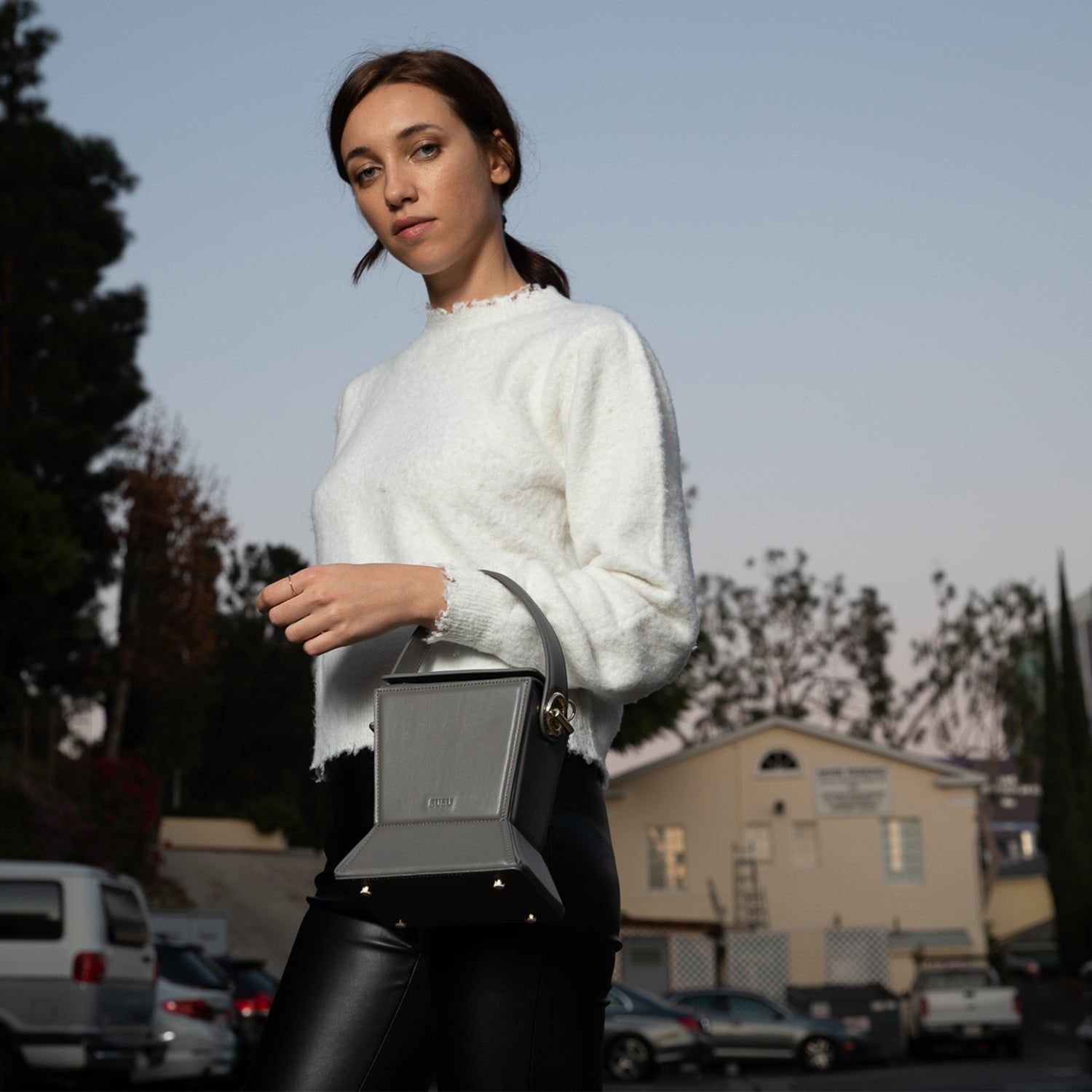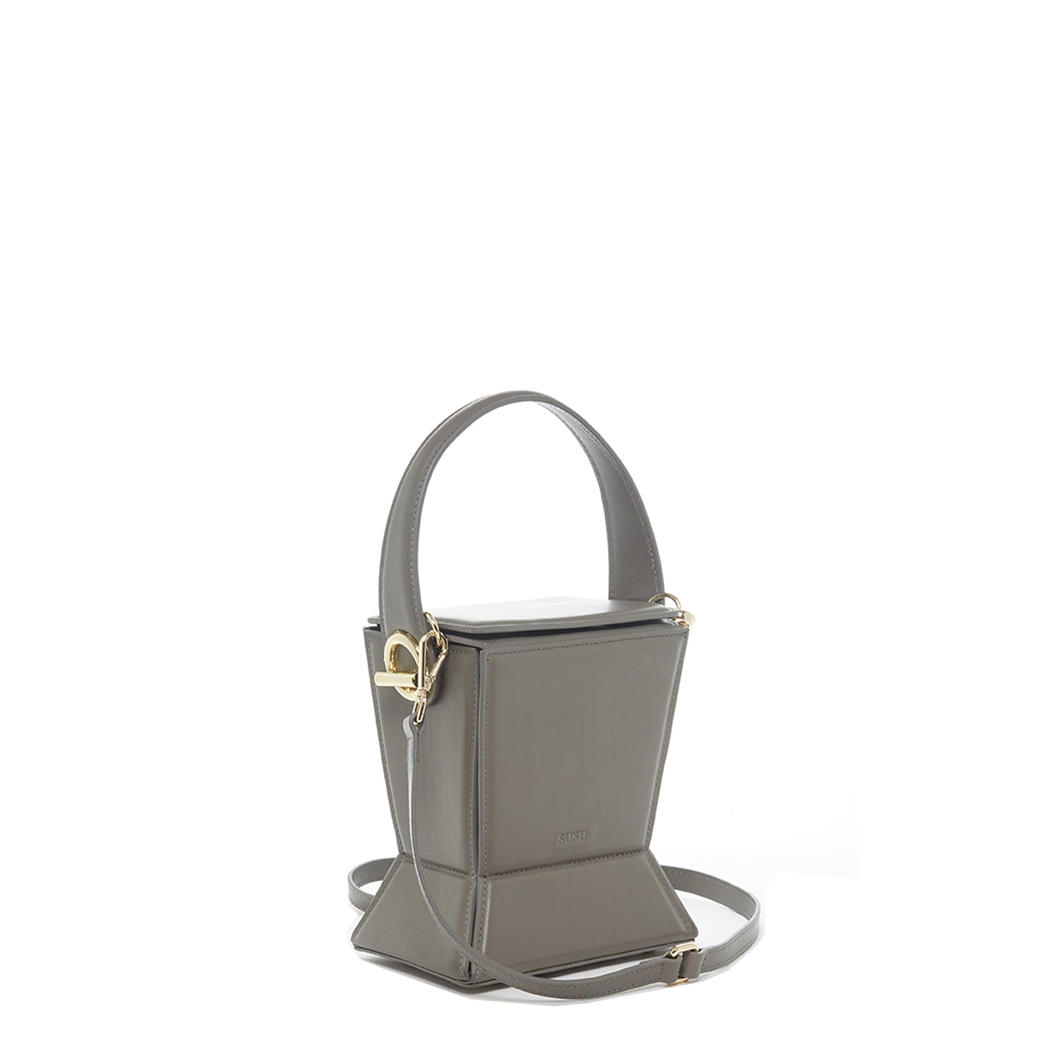 Make heads turn with The Amber, a truly one of a kind leather crossbody bag. It’s a must have for anyone that likes to stand out with unique purses. It has a modern geometric design that is complemented with smooth dark frost gray leather, light gold hardware, and a coffee cotton lining. T his unique smoke gray leather bucket bag is more than just eye candy - it has a functional design with a strong double magnetic closure for easy access and folds out into a roomy accordion shape which you'll find a surprisingly spacious interior. It also comes with an adjustable and removable cross over strap, so you can wear it as a cross body purse or carry it by the top handle as a bucket barrel bag . However you decide to style it, this unique vase shape handbag will definitely take your outfit to the next level.