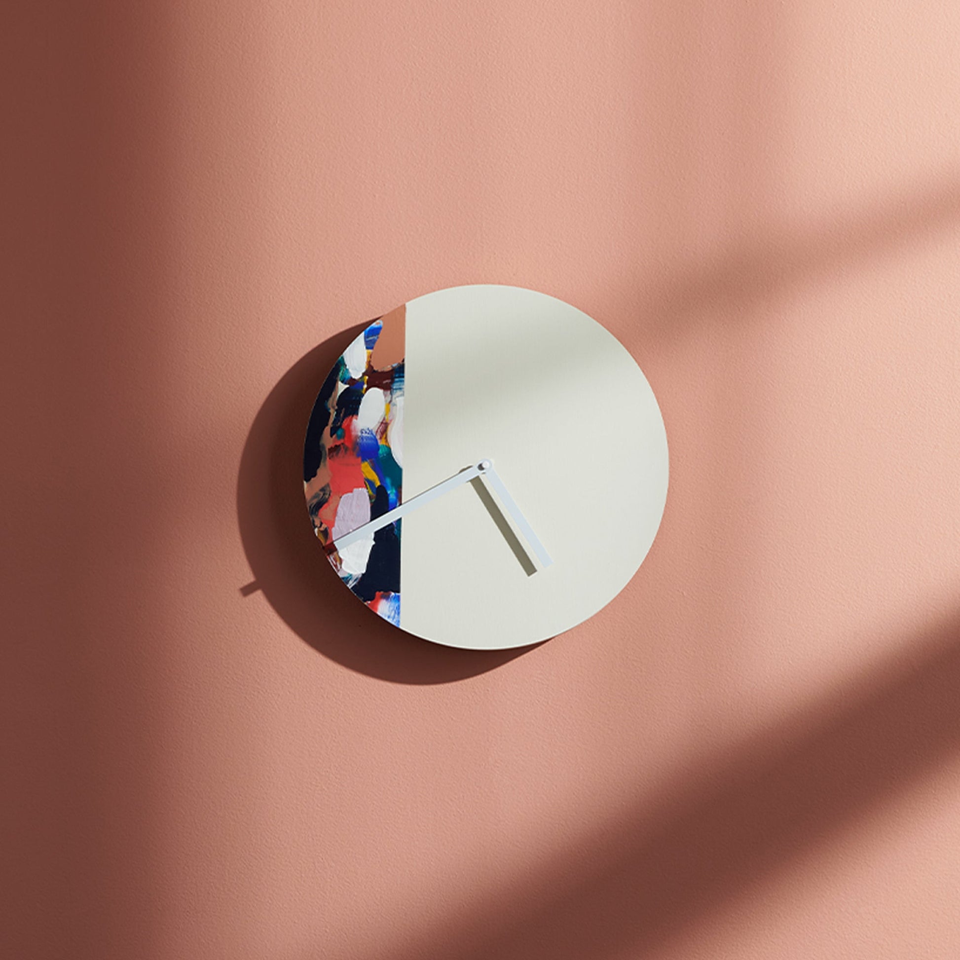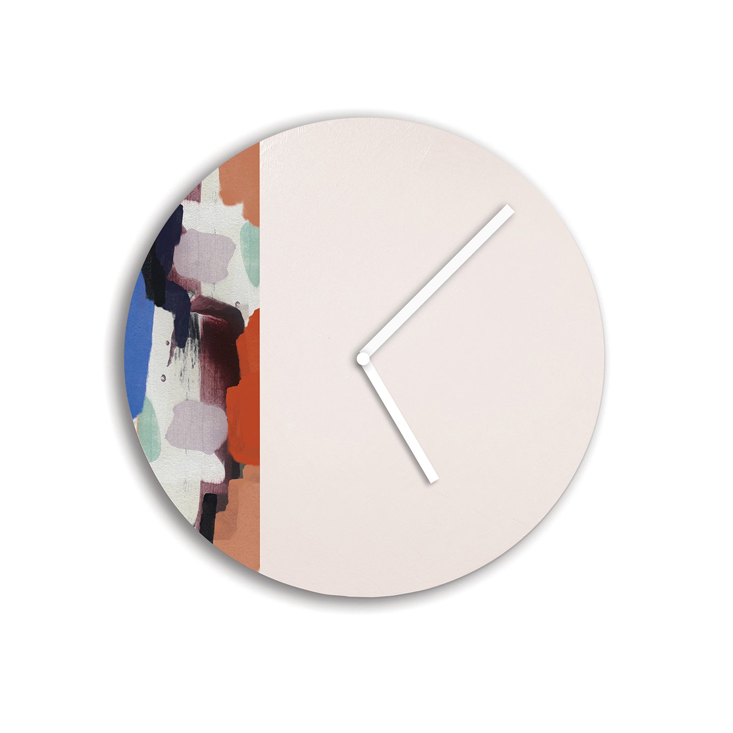 A functional art piece. Each clock is hand painted, crafted, and assembled in our studio from wood. 14" in diameter, 1.75" in depth and is packaged in a custom box. Our clocks weigh 2.9 lbs and will hang with a nail or heavy-duty poster tape. The clock movement is silent.