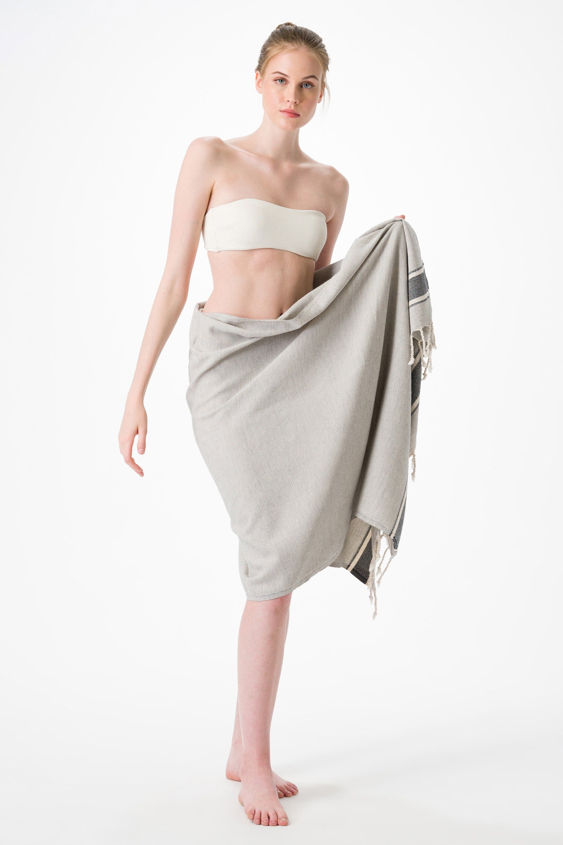 Our Terra Turkish Towel / Throws are hand-loomed from premium Turkish cotton. Beautiful and practical, these heirloom quality towels become softer and stronger overtime. Hand-loomed from the finest long-staple Turkish Cotton Combines gray background with subtle horizontal stripes Elegant yet super durable and functional Lightweight, soft, absorbent and quick drying Generously sized with standard Bath Sheet dimensions for added coverage Extremely versatile, works beautifully as a towel, throw, scarf, shawl or sarong Finished with hand-knotted fringe OEKO-TEX® STANDARD 100 certified, IS025 168850 OETI Free of harmful chemicals and dyes – good for you and the environment Pairs perfectly with our Terra Turkish Hand / Kitchen Towel Made in Turkey ______________________________________________ Materials: 100% Premium Turkish Cotton Size: 36"x77" Weight: 345g/12.2oz Care: Machine wash cold or up to 30℃ in gentle cycle. Avoid fabric softeners, dryer sheets and bleach. Air Dry or Tumble Dry low heat in gentle cycle. We recommend Air Dry as Turkish towels air dry quickly, so you may hang them to dry. Fringes of Turkish Towels are handcrafted. They are very nice and durable but, sometimes may come untied. There is a simple process to fix untied fringes on a Turkish Towel. Learn how here⇒ How to Easily Fix Untied Fringes on Turkish Towels Handcrafted by Olive and Linen ______________________________________________