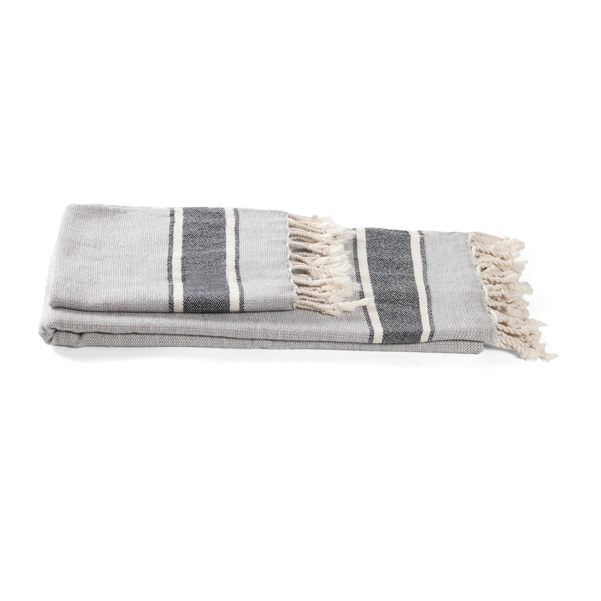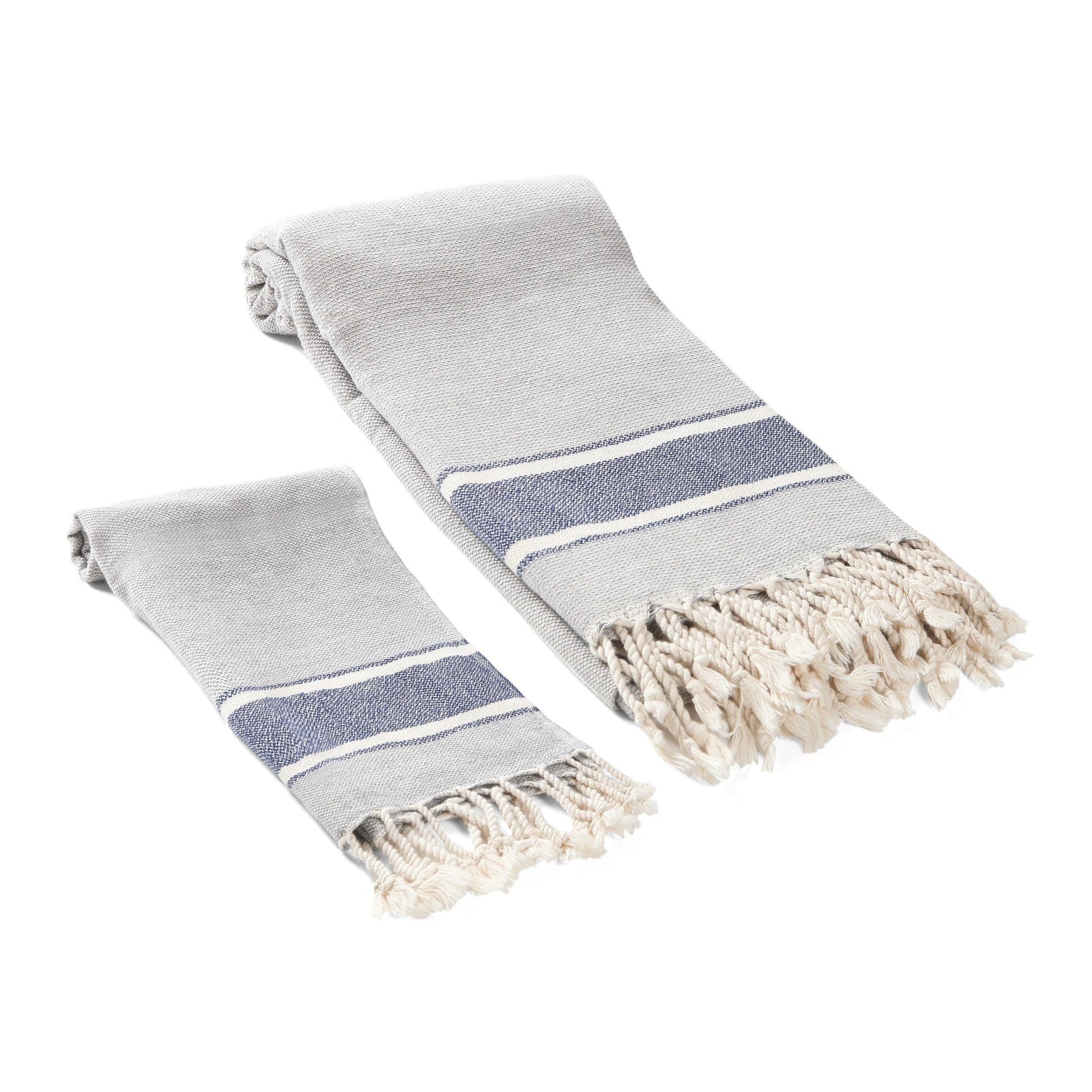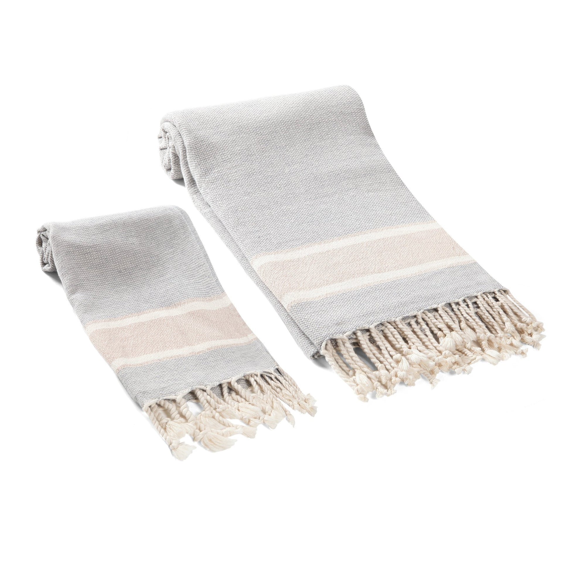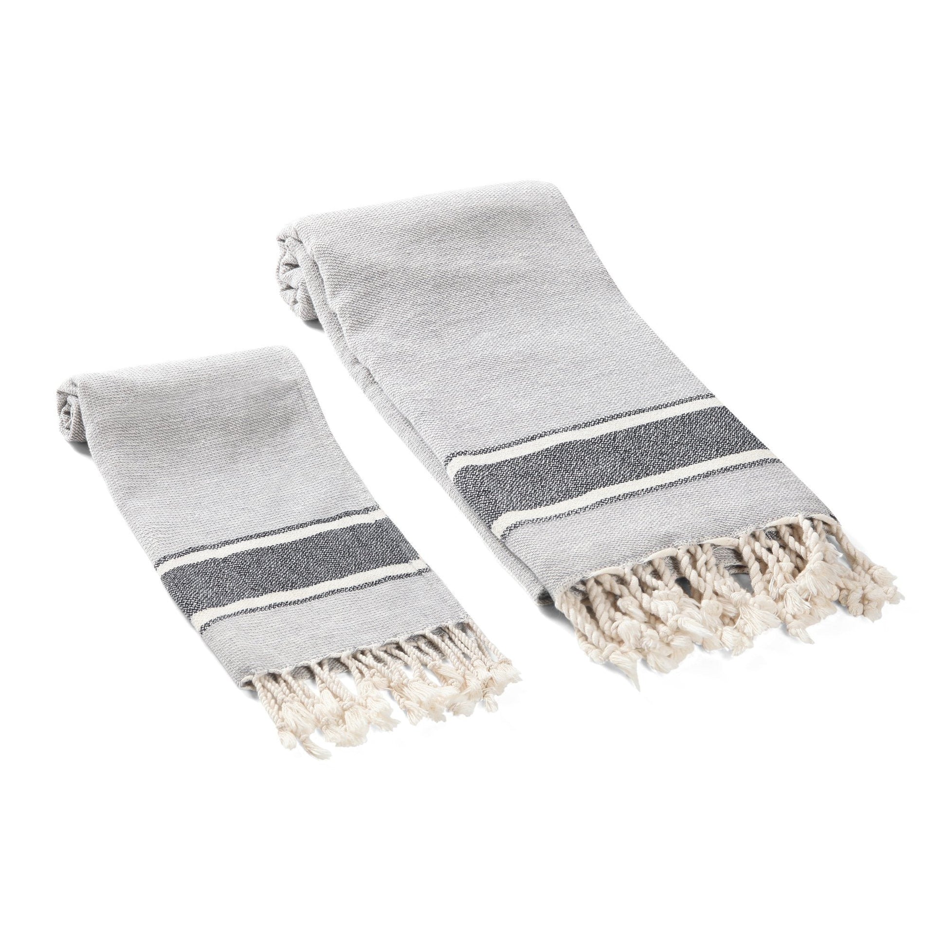 Our Terra Turkish Turkish Towel Set is hand-loomed from premium Turkish cotton. Beautiful and practical, these heirloom quality towels become softer and stronger overtime. Hand-loomed from the finest long-staple Turkish Cotton Combines gray background with subtle horizontal stripes Elegant yet super durable and functional Lightweight, soft, absorbent and quick drying Generously sized with standard Bath Sheet dimensions for added coverage Extremely versatile, works beautifully as a towel, throw, scarf, shawl or sarong The set includes one bath size and one hand size Terra Turkish towel in coordinating color packaged individually Finished with hand-knotted fringe OEKO-TEX® STANDARD 100 certified, IS025 168850 OETI Free of harmful chemicals and dyes – good for you and the environment Made in Turkey ______________________________________________ Materials: 100% Premium Turkish Cotton Size: 36"x77" and 20"x40" Weight: 345g/12.2oz and 92g/3.2oz Care: Machine wash cold or up to 30℃ in gentle cycle. Avoid fabric softeners, dryer sheets and bleach. Air Dry or Tumble Dry low heat in gentle cycle. We recommend Air Dry as Turkish towels air dry quickly, so you may hang them to dry. Fringes of Turkish Towels are handcrafted. They are very nice and durable but, sometimes may come untied. There is a simple process to fix untied fringes on a Turkish Towel. Learn how here⇒ How to Easily Fix Untied Fringes on Turkish Towels Handcrafted by Olive and Linen ______________________________________________
