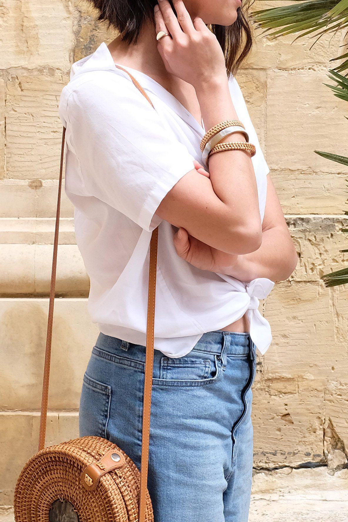 Earthy and effortlessly-chic, this Thuy Binh Buffalo Horn & Rattan Bangles (3pcs) by Hathorway features two bangles that are intricately handwoven with rattan stems by artisans in northern Vietnam using rattan. Rattan is a climbing palm found in Southeast Asia; and similar to the strength and durability of bamboo, rattan has been used for many years to make baskets and trays. At Hathorway, our is planted, harvested, sorted and dried carefully in the province of Nam Dinh, Vietnam. Sandwiched between the two rattan bangles is a bangle made of ethically-sourced buffalo horn. As a sustainable fashion accessories brand, we thoughtfully selected buffalo horn as our primary material because it is a by-product of waste, a chemical-free process, an organic material, and a one-of-a-kind piece. These artisanal, eco friendly, sustainable bangles are lightweight and comfortable for your all-day wear. Wear them on the weekends and take them along on your exotic trips to add a nature vibe to your ensemble.