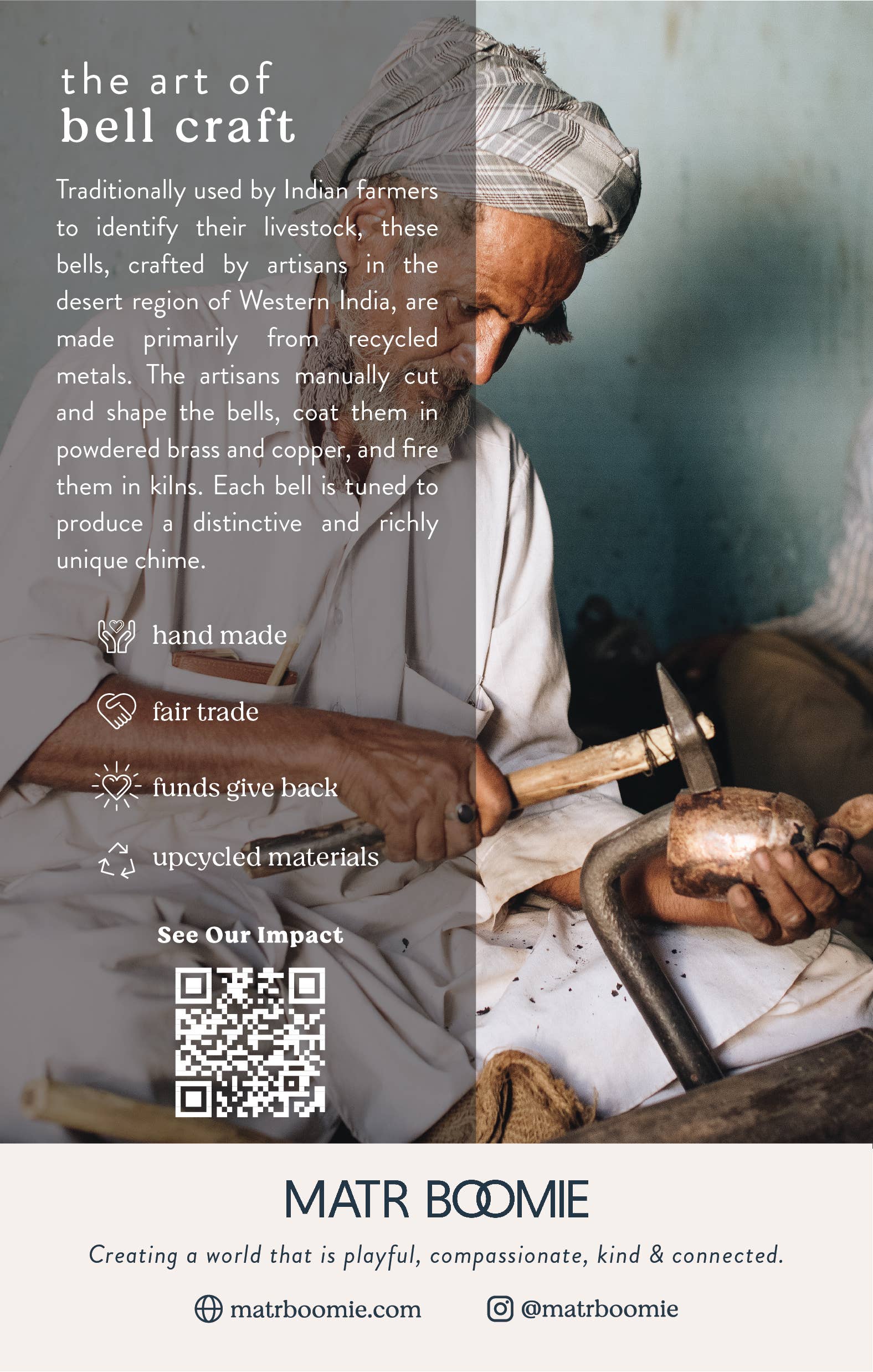 The Trio Rustic Bells Cascade Hanging Wind Chime will add a boho charm to an indoor or outdoor patio area. The hand crafted and hand tuned nature of our rustic bells makes them a unique gift to elevate interiors. for a new home as a housewarming gift or as a wedding gift. These bells can also be used as unique wedding decor on the special day! The sites and sounds would uplift the atmosphere in any space. All of Matr Boomie's collections are artisan made, fair trade, and sustainable.