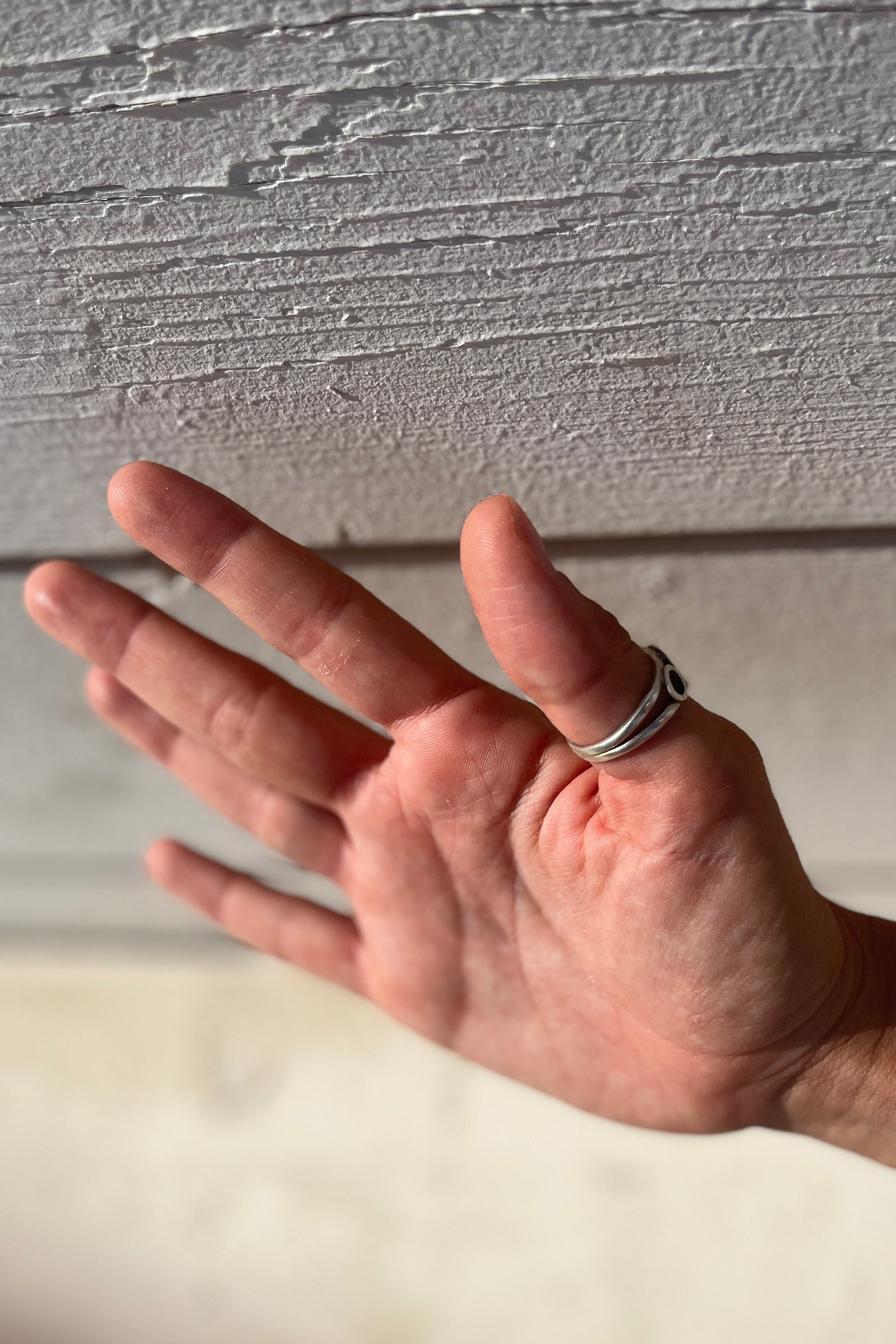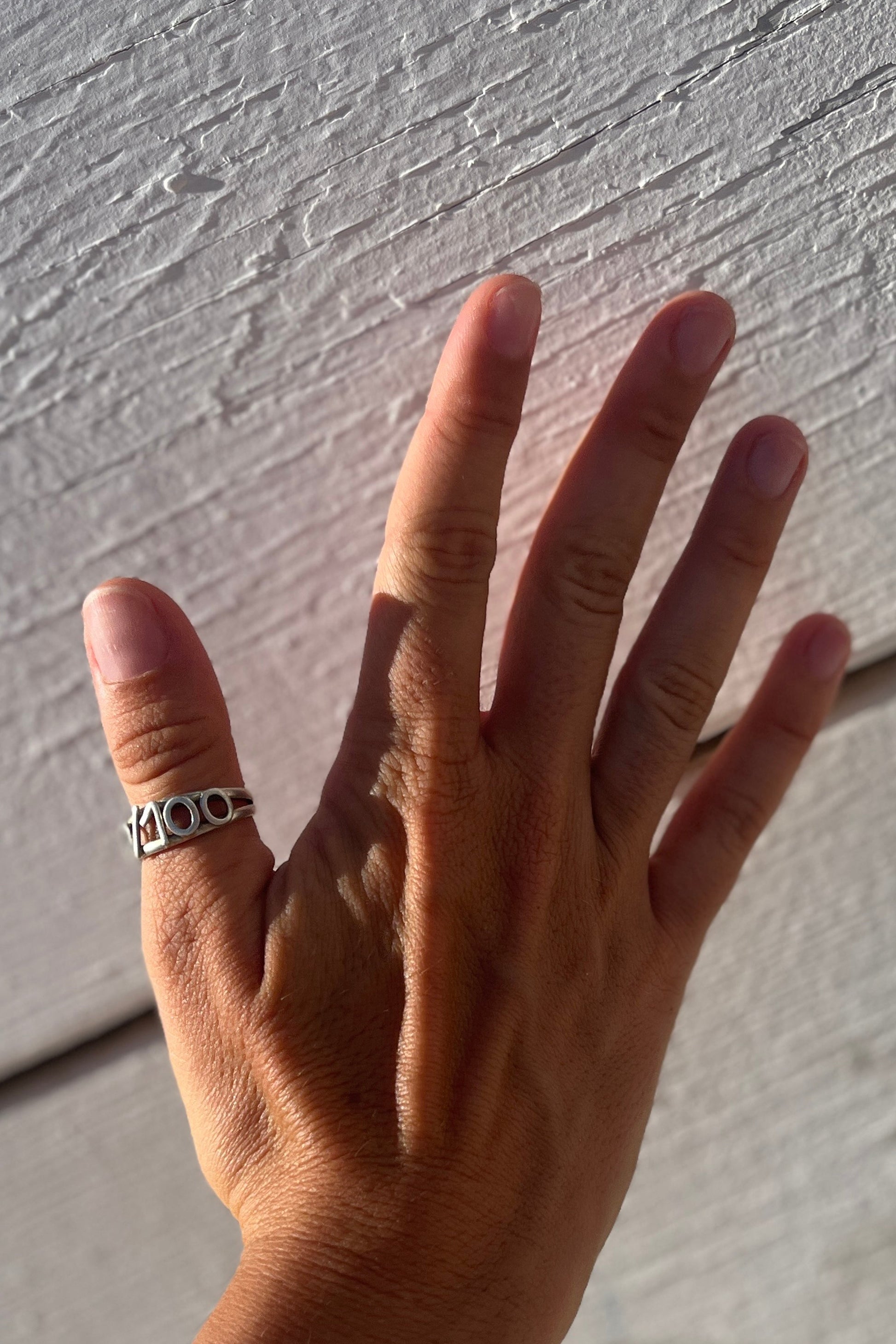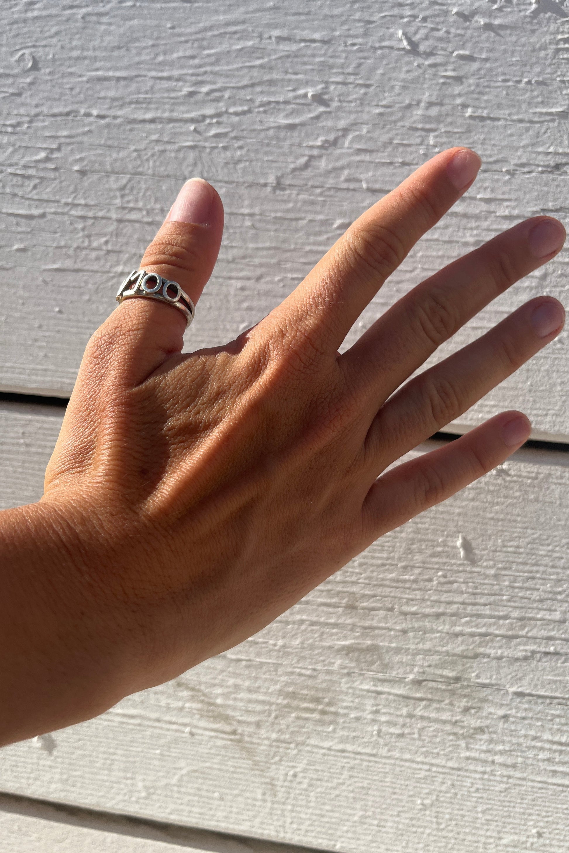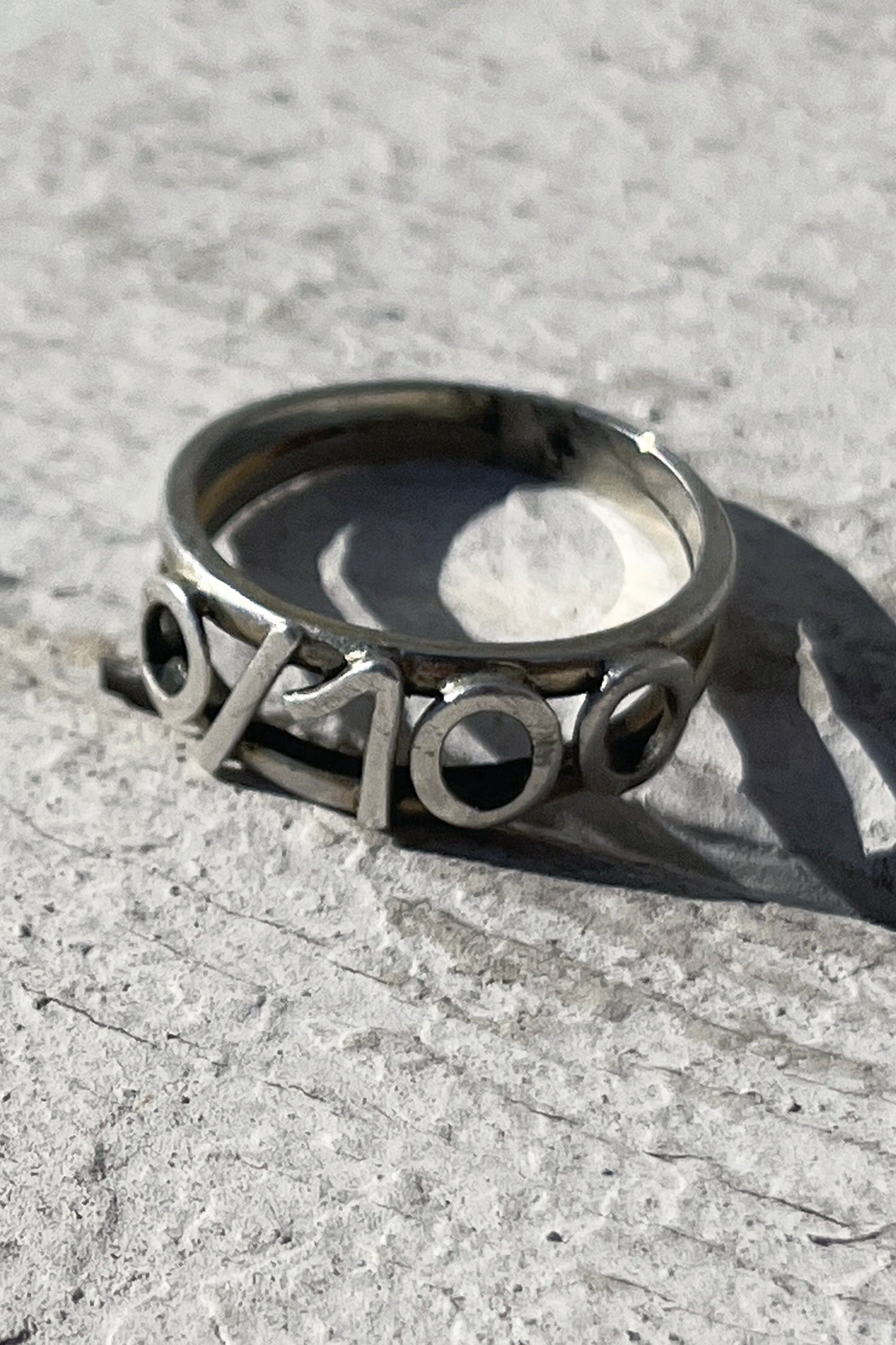 Two fine, interlocking silver bands combined to create an irresistibly bold ring with our logo on the front side.